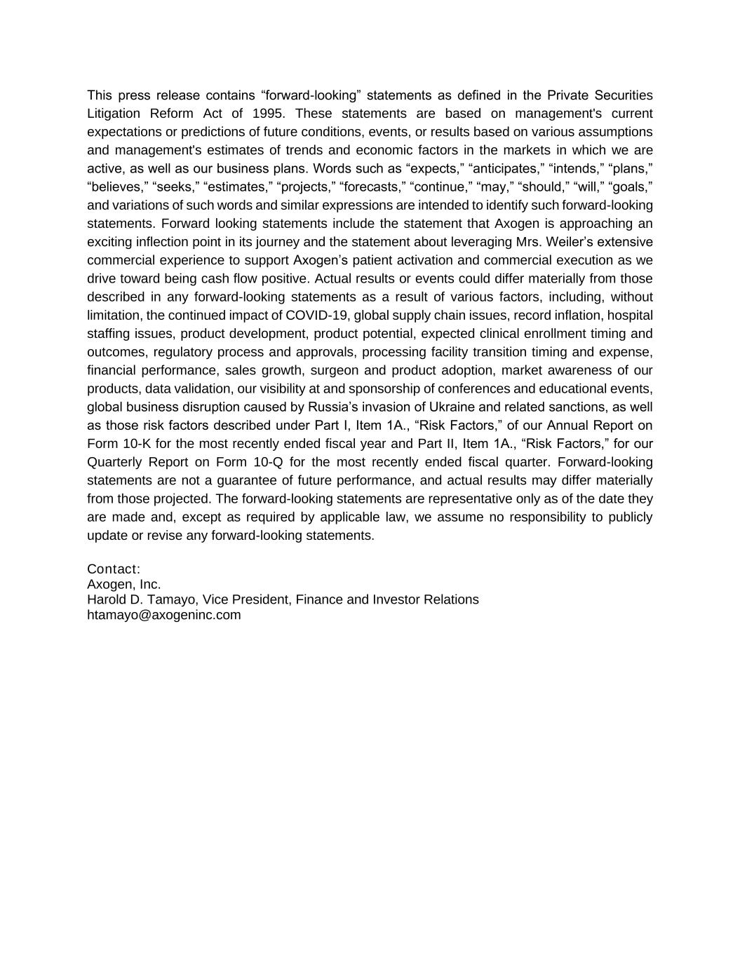 This press release contains “forward-looking” statements as defined in the Private Securities Litigation Reform Act of 1995. These statements are based on management's current expectations or predictions of future conditions, events, or results based on various assumptions and management's estimates of trends and economic factors in the markets in which we are active, as well as our business plans. Words such as “expects,” “anticipates,” “intends,” “plans,” “believes,” “seeks,” “estimates,” “projects,” “forecasts,” “continue,” “may,” “should,” “will,” “goals,” and variations of such words and similar expressions are intended to identify such forward-looking statements. Forward looking statements include the statement that Axogen is approaching an exciting inflection point in its journey and the statement about leveraging Mrs. Weiler’s extensive commercial experience to support Axogen’s patient activation and commercial execution as we drive toward being cash flow positive. Actual results or events could differ materially from those described in any forward-looking statements as a result of various factors, including, without limitation, the continued impact of COVID-19, global supply chain issues, record inflation, hospital staffing issues, product development, product potential, expected clinical enrollment timing and outcomes, regulatory process and approvals, processing facility transition timing and expense, financial performance, sales growth, surgeon and product adoption, market awareness of our products, data validation, our visibility at and sponsorship of conferences and educational events, global business disruption caused by Russia’s invasion of Ukraine and related sanctions, as well as those risk factors described under Part I, Item 1A., “Risk Factors,” of our Annual Report on Form 10-K for the most recently ended fiscal year and Part II, Item 1A., “Risk Factors,” for our Quarterly Report on Form 10-Q for the most recently ended fiscal quarter. Forward-looking statements are not a guarantee of future performance, and actual results may differ materially from those projected. The forward-looking statements are representative only as of the date they are made and, except as required by applicable law, we assume no responsibility to publicly update or revise any forward-looking statements. Contact: Axogen, Inc. Harold D. Tamayo, Vice President, Finance and Investor Relations htamayo@axogeninc.com
