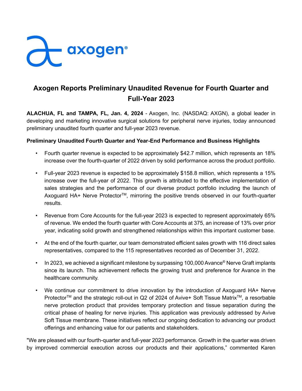 Axogen Reports Preliminary Unaudited Revenue for Fourth Quarter and Full-Year 2023 ALACHUA, FL and TAMPA, FL, Jan. 4, 2024 - Axogen, Inc. (NASDAQ: AXGN), a global leader in developing and marketing innovative surgical solutions for peripheral nerve injuries, today announced preliminary unaudited fourth quarter and full-year 2023 revenue. Preliminary Unaudited Fourth Quarter and Year-End Performance and Business Highlights • Fourth quarter revenue is expected to be approximately $42.7 million, which represents an 18% increase over the fourth-quarter of 2022 driven by solid performance across the product portfolio. • Full-year 2023 revenue is expected to be approximately $158.8 million, which represents a 15% increase over the full-year of 2022. This growth is attributed to the effective implementation of sales strategies and the performance of our diverse product portfolio including the launch of Axoguard HA+ Nerve ProtectorTM, mirroring the positive trends observed in our fourth-quarter results. • Revenue from Core Accounts for the full-year 2023 is expected to represent approximately 65% of revenue. We ended the fourth quarter with Core Accounts at 375, an increase of 13% over prior year, indicating solid growth and strengthened relationships within this important customer base. • At the end of the fourth quarter, our team demonstrated efficient sales growth with 116 direct sales representatives, compared to the 115 representatives recorded as of December 31, 2022. • In 2023, we achieved a significant milestone by surpassing 100,000 Avance® Nerve Graft implants since its launch. This achievement reflects the growing trust and preference for Avance in the healthcare community. • We continue our commitment to drive innovation by the introduction of Axoguard HA+ Nerve ProtectorTM and the strategic roll-out in Q2 of 2024 of Avive+ Soft Tissue MatrixTM, a resorbable nerve protection product that provides temporary protection and tissue separation during the critical phase of healing for nerve injuries. This application was previously addressed by Avive Soft Tissue membrane. These initiatives reflect our ongoing dedication to advancing our product offerings and enhancing value for our patients and stakeholders. "We are pleased with our fourth-quarter and full-year 2023 performance. Growth in the quarter was driven by improved commercial execution across our products and their applications,” commented Karen