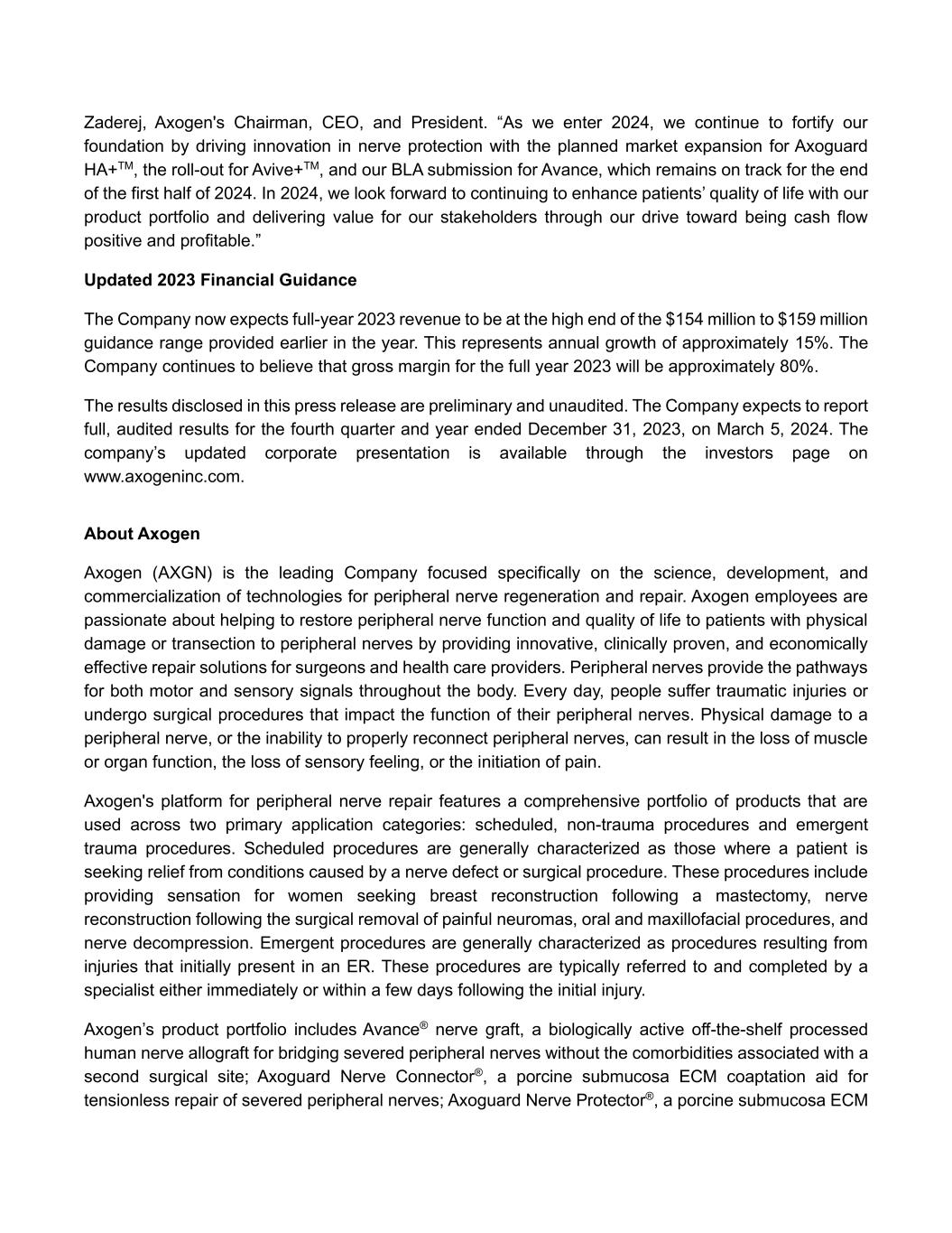 Zaderej, Axogen's Chairman, CEO, and President. “As we enter 2024, we continue to fortify our foundation by driving innovation in nerve protection with the planned market expansion for Axoguard HA+TM, the roll-out for Avive+TM, and our BLA submission for Avance, which remains on track for the end of the first half of 2024. In 2024, we look forward to continuing to enhance patients’ quality of life with our product portfolio and delivering value for our stakeholders through our drive toward being cash flow positive and profitable.” Updated 2023 Financial Guidance The Company now expects full-year 2023 revenue to be at the high end of the $154 million to $159 million guidance range provided earlier in the year. This represents annual growth of approximately 15%. The Company continues to believe that gross margin for the full year 2023 will be approximately 80%. The results disclosed in this press release are preliminary and unaudited. The Company expects to report full, audited results for the fourth quarter and year ended December 31, 2023, on March 5, 2024. The company’s updated corporate presentation is available through the investors page on www.axogeninc.com. About Axogen Axogen (AXGN) is the leading Company focused specifically on the science, development, and commercialization of technologies for peripheral nerve regeneration and repair. Axogen employees are passionate about helping to restore peripheral nerve function and quality of life to patients with physical damage or transection to peripheral nerves by providing innovative, clinically proven, and economically effective repair solutions for surgeons and health care providers. Peripheral nerves provide the pathways for both motor and sensory signals throughout the body. Every day, people suffer traumatic injuries or undergo surgical procedures that impact the function of their peripheral nerves. Physical damage to a peripheral nerve, or the inability to properly reconnect peripheral nerves, can result in the loss of muscle or organ function, the loss of sensory feeling, or the initiation of pain. Axogen's platform for peripheral nerve repair features a comprehensive portfolio of products that are used across two primary application categories: scheduled, non-trauma procedures and emergent trauma procedures. Scheduled procedures are generally characterized as those where a patient is seeking relief from conditions caused by a nerve defect or surgical procedure. These procedures include providing sensation for women seeking breast reconstruction following a mastectomy, nerve reconstruction following the surgical removal of painful neuromas, oral and maxillofacial procedures, and nerve decompression. Emergent procedures are generally characterized as procedures resulting from injuries that initially present in an ER. These procedures are typically referred to and completed by a specialist either immediately or within a few days following the initial injury. Axogen’s product portfolio includes Avance® nerve graft, a biologically active off-the-shelf processed human nerve allograft for bridging severed peripheral nerves without the comorbidities associated with a second surgical site; Axoguard Nerve Connector®, a porcine submucosa ECM coaptation aid for tensionless repair of severed peripheral nerves; Axoguard Nerve Protector®, a porcine submucosa ECM