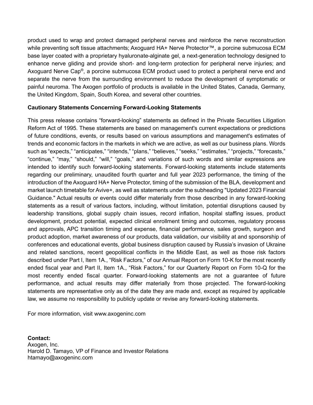 product used to wrap and protect damaged peripheral nerves and reinforce the nerve reconstruction while preventing soft tissue attachments; Axoguard HA+ Nerve Protector™, a porcine submucosa ECM base layer coated with a proprietary hyaluronate-alginate gel, a next-generation technology designed to enhance nerve gliding and provide short- and long-term protection for peripheral nerve injuries; and Axoguard Nerve Cap®, a porcine submucosa ECM product used to protect a peripheral nerve end and separate the nerve from the surrounding environment to reduce the development of symptomatic or painful neuroma. The Axogen portfolio of products is available in the United States, Canada, Germany, the United Kingdom, Spain, South Korea, and several other countries. Cautionary Statements Concerning Forward-Looking Statements This press release contains “forward-looking” statements as defined in the Private Securities Litigation Reform Act of 1995. These statements are based on management's current expectations or predictions of future conditions, events, or results based on various assumptions and management's estimates of trends and economic factors in the markets in which we are active, as well as our business plans. Words such as “expects,” “anticipates,” “intends,” “plans,” “believes,” “seeks,” “estimates,” “projects,” “forecasts,” “continue,” “may,” “should,” “will,” “goals,” and variations of such words and similar expressions are intended to identify such forward-looking statements. Forward-looking statements include statements regarding our preliminary, unaudited fourth quarter and full year 2023 performance, the timing of the introduction of the Axoguard HA+ Nerve Protector, timing of the submission of the BLA, development and market launch timetable for Avive+, as well as statements under the subheading "Updated 2023 Financial Guidance." Actual results or events could differ materially from those described in any forward-looking statements as a result of various factors, including, without limitation, potential disruptions caused by leadership transitions, global supply chain issues, record inflation, hospital staffing issues, product development, product potential, expected clinical enrollment timing and outcomes, regulatory process and approvals, APC transition timing and expense, financial performance, sales growth, surgeon and product adoption, market awareness of our products, data validation, our visibility at and sponsorship of conferences and educational events, global business disruption caused by Russia’s invasion of Ukraine and related sanctions, recent geopolitical conflicts in the Middle East, as well as those risk factors described under Part I, Item 1A., “Risk Factors,” of our Annual Report on Form 10-K for the most recently ended fiscal year and Part II, Item 1A., “Risk Factors,” for our Quarterly Report on Form 10-Q for the most recently ended fiscal quarter. Forward-looking statements are not a guarantee of future performance, and actual results may differ materially from those projected. The forward-looking statements are representative only as of the date they are made and, except as required by applicable law, we assume no responsibility to publicly update or revise any forward-looking statements. For more information, visit www.axogeninc.com Contact: Axogen, Inc. Harold D. Tamayo, VP of Finance and Investor Relations htamayo@axogeninc.com