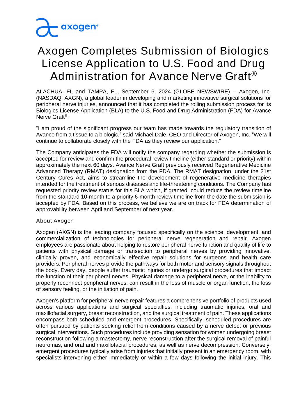 Axogen Completes Submission of Biologics License Application to U.S. Food and Drug Administration for Avance Nerve Graft® ALACHUA, FL and TAMPA, FL, September 6, 2024 (GLOBE NEWSWIRE) -- Axogen, Inc. (NASDAQ: AXGN), a global leader in developing and marketing innovative surgical solutions for peripheral nerve injuries, announced that it has completed the rolling submission process for its Biologics License Application (BLA) to the U.S. Food and Drug Administration (FDA) for Avance Nerve Graft®. “I am proud of the significant progress our team has made towards the regulatory transition of Avance from a tissue to a biologic,” said Michael Dale, CEO and Director of Axogen, Inc. “We will continue to collaborate closely with the FDA as they review our application.” The Company anticipates the FDA will notify the company regarding whether the submission is accepted for review and confirm the procedural review timeline (either standard or priority) within approximately the next 60 days. Avance Nerve Graft previously received Regenerative Medicine Advanced Therapy (RMAT) designation from the FDA. The RMAT designation, under the 21st Century Cures Act, aims to streamline the development of regenerative medicine therapies intended for the treatment of serious diseases and life-threatening conditions. The Company has requested priority review status for this BLA which, if granted, could reduce the review timeline from the standard 10-month to a priority 6-month review timeline from the date the submission is accepted by FDA. Based on this process, we believe we are on track for FDA determination of approvability between April and September of next year. About Axogen Axogen (AXGN) is the leading company focused specifically on the science, development, and commercialization of technologies for peripheral nerve regeneration and repair. Axogen employees are passionate about helping to restore peripheral nerve function and quality of life to patients with physical damage or transection to peripheral nerves by providing innovative, clinically proven, and economically effective repair solutions for surgeons and health care providers. Peripheral nerves provide the pathways for both motor and sensory signals throughout the body. Every day, people suffer traumatic injuries or undergo surgical procedures that impact the function of their peripheral nerves. Physical damage to a peripheral nerve, or the inability to properly reconnect peripheral nerves, can result in the loss of muscle or organ function, the loss of sensory feeling, or the initiation of pain. Axogen's platform for peripheral nerve repair features a comprehensive portfolio of products used across various applications and surgical specialties, including traumatic injuries, oral and maxillofacial surgery, breast reconstruction, and the surgical treatment of pain. These applications encompass both scheduled and emergent procedures. Specifically, scheduled procedures are often pursued by patients seeking relief from conditions caused by a nerve defect or previous surgical interventions. Such procedures include providing sensation for women undergoing breast reconstruction following a mastectomy, nerve reconstruction after the surgical removal of painful neuromas, and oral and maxillofacial procedures, as well as nerve decompression. Conversely, emergent procedures typically arise from injuries that initially present in an emergency room, with specialists intervening either immediately or within a few days following the initial injury. This