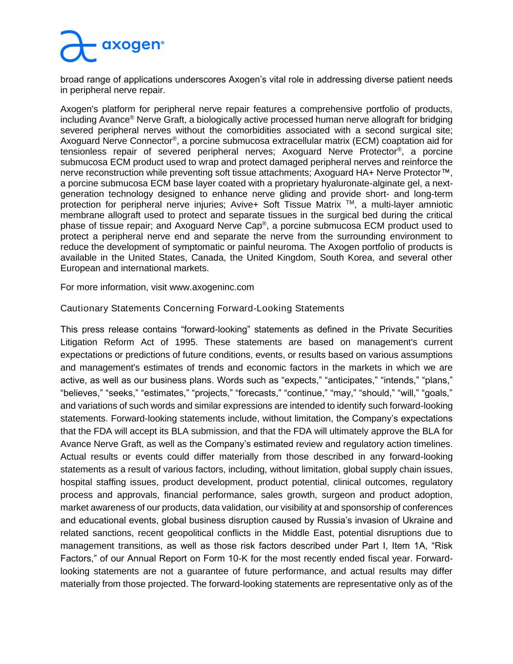 broad range of applications underscores Axogen’s vital role in addressing diverse patient needs in peripheral nerve repair. Axogen's platform for peripheral nerve repair features a comprehensive portfolio of products, including Avance® Nerve Graft, a biologically active processed human nerve allograft for bridging severed peripheral nerves without the comorbidities associated with a second surgical site; Axoguard Nerve Connector®, a porcine submucosa extracellular matrix (ECM) coaptation aid for tensionless repair of severed peripheral nerves; Axoguard Nerve Protector®, a porcine submucosa ECM product used to wrap and protect damaged peripheral nerves and reinforce the nerve reconstruction while preventing soft tissue attachments; Axoguard HA+ Nerve Protector™, a porcine submucosa ECM base layer coated with a proprietary hyaluronate-alginate gel, a next- generation technology designed to enhance nerve gliding and provide short- and long-term protection for peripheral nerve injuries; Avive+ Soft Tissue Matrix TM, a multi-layer amniotic membrane allograft used to protect and separate tissues in the surgical bed during the critical phase of tissue repair; and Axoguard Nerve Cap®, a porcine submucosa ECM product used to protect a peripheral nerve end and separate the nerve from the surrounding environment to reduce the development of symptomatic or painful neuroma. The Axogen portfolio of products is available in the United States, Canada, the United Kingdom, South Korea, and several other European and international markets. For more information, visit www.axogeninc.com Cautionary Statements Concerning Forward-Looking Statements This press release contains “forward-looking” statements as defined in the Private Securities Litigation Reform Act of 1995. These statements are based on management's current expectations or predictions of future conditions, events, or results based on various assumptions and management's estimates of trends and economic factors in the markets in which we are active, as well as our business plans. Words such as “expects,” “anticipates,” “intends,” “plans,” “believes,” “seeks,” “estimates,” “projects,” “forecasts,” “continue,” “may,” “should,” “will,” “goals,” and variations of such words and similar expressions are intended to identify such forward-looking statements. Forward-looking statements include, without limitation, the Company’s expectations that the FDA will accept its BLA submission, and that the FDA will ultimately approve the BLA for Avance Nerve Graft, as well as the Company’s estimated review and regulatory action timelines. Actual results or events could differ materially from those described in any forward-looking statements as a result of various factors, including, without limitation, global supply chain issues, hospital staffing issues, product development, product potential, clinical outcomes, regulatory process and approvals, financial performance, sales growth, surgeon and product adoption, market awareness of our products, data validation, our visibility at and sponsorship of conferences and educational events, global business disruption caused by Russia’s invasion of Ukraine and related sanctions, recent geopolitical conflicts in the Middle East, potential disruptions due to management transitions, as well as those risk factors described under Part I, Item 1A, “Risk Factors,” of our Annual Report on Form 10-K for the most recently ended fiscal year. Forward- looking statements are not a guarantee of future performance, and actual results may differ materially from those projected. The forward-looking statements are representative only as of the
