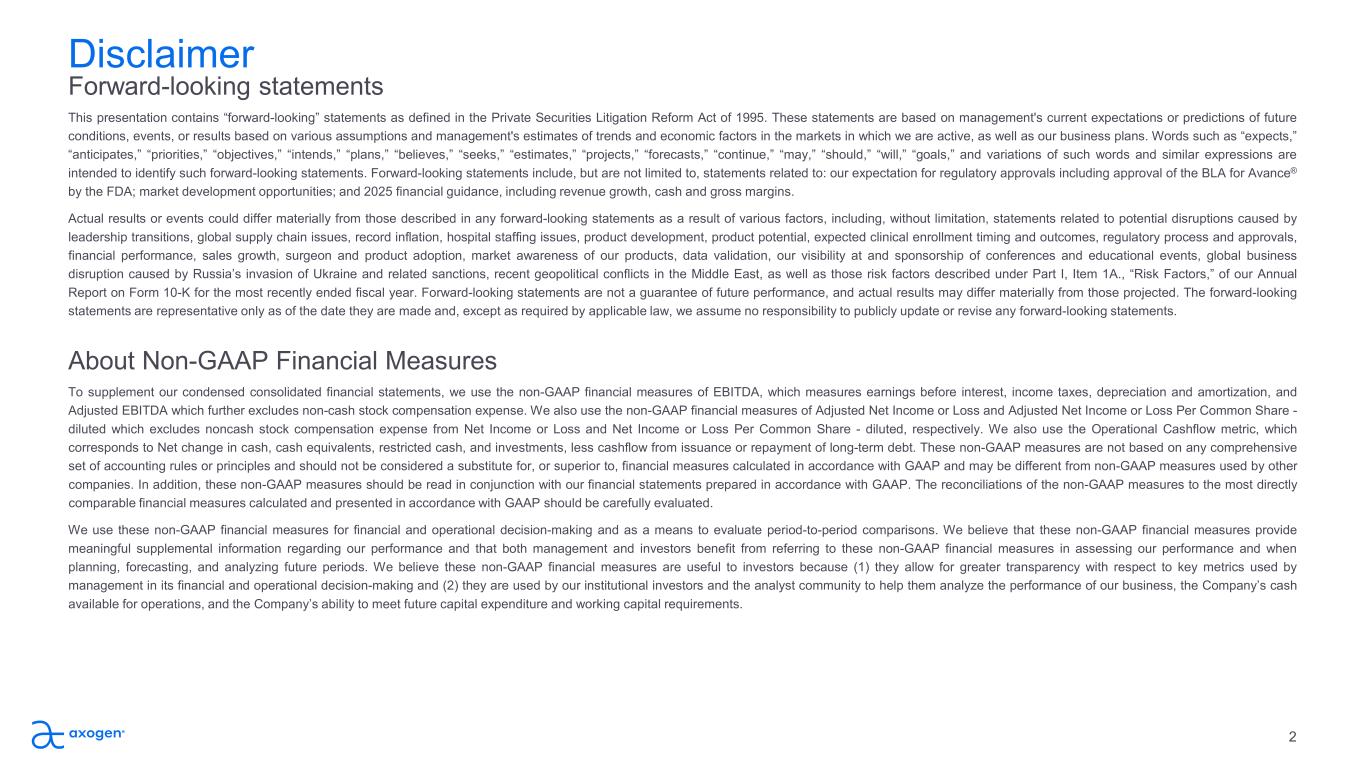 Disclaimer 2 Forward-looking statements This presentation contains “forward-looking” statements as defined in the Private Securities Litigation Reform Act of 1995. These statements are based on management's current expectations or predictions of future conditions, events, or results based on various assumptions and management's estimates of trends and economic factors in the markets in which we are active, as well as our business plans. Words such as “expects,” “anticipates,” “priorities,” “objectives,” “intends,” “plans,” “believes,” “seeks,” “estimates,” “projects,” “forecasts,” “continue,” “may,” “should,” “will,” “goals,” and variations of such words and similar expressions are intended to identify such forward-looking statements. Forward-looking statements include, but are not limited to, statements related to: our expectation for regulatory approvals including approval of the BLA for Avance® by the FDA; market development opportunities; and 2025 financial guidance, including revenue growth, cash and gross margins. Actual results or events could differ materially from those described in any forward-looking statements as a result of various factors, including, without limitation, statements related to potential disruptions caused by leadership transitions, global supply chain issues, record inflation, hospital staffing issues, product development, product potential, expected clinical enrollment timing and outcomes, regulatory process and approvals, financial performance, sales growth, surgeon and product adoption, market awareness of our products, data validation, our visibility at and sponsorship of conferences and educational events, global business disruption caused by Russia’s invasion of Ukraine and related sanctions, recent geopolitical conflicts in the Middle East, as well as those risk factors described under Part I, Item 1A., “Risk Factors,” of our Annual Report on Form 10-K for the most recently ended fiscal year. Forward-looking statements are not a guarantee of future performance, and actual results may differ materially from those projected. The forward-looking statements are representative only as of the date they are made and, except as required by applicable law, we assume no responsibility to publicly update or revise any forward-looking statements. About Non-GAAP Financial Measures To supplement our condensed consolidated financial statements, we use the non-GAAP financial measures of EBITDA, which measures earnings before interest, income taxes, depreciation and amortization, and Adjusted EBITDA which further excludes non-cash stock compensation expense. We also use the non-GAAP financial measures of Adjusted Net Income or Loss and Adjusted Net Income or Loss Per Common Share - diluted which excludes noncash stock compensation expense from Net Income or Loss and Net Income or Loss Per Common Share - diluted, respectively. We also use the Operational Cashflow metric, which corresponds to Net change in cash, cash equivalents, restricted cash, and investments, less cashflow from issuance or repayment of long-term debt. These non-GAAP measures are not based on any comprehensive set of accounting rules or principles and should not be considered a substitute for, or superior to, financial measures calculated in accordance with GAAP and may be different from non-GAAP measures used by other companies. In addition, these non-GAAP measures should be read in conjunction with our financial statements prepared in accordance with GAAP. The reconciliations of the non-GAAP measures to the most directly comparable financial measures calculated and presented in accordance with GAAP should be carefully evaluated. We use these non-GAAP financial measures for financial and operational decision-making and as a means to evaluate period-to-period comparisons. We believe that these non-GAAP financial measures provide meaningful supplemental information regarding our performance and that both management and investors benefit from referring to these non-GAAP financial measures in assessing our performance and when planning, forecasting, and analyzing future periods. We believe these non-GAAP financial measures are useful to investors because (1) they allow for greater transparency with respect to key metrics used by management in its financial and operational decision-making and (2) they are used by our institutional investors and the analyst community to help them analyze the performance of our business, the Company’s cash available for operations, and the Company’s ability to meet future capital expenditure and working capital requirements.