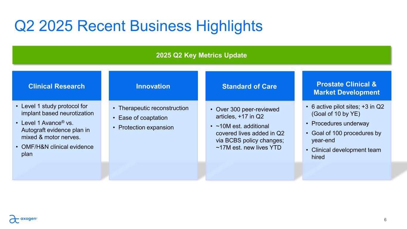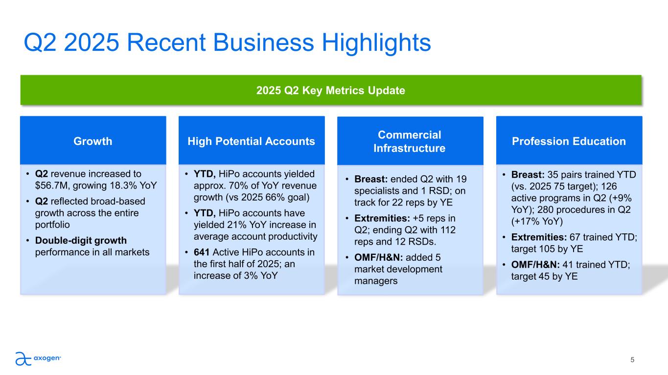 5 Growth • Q2 revenue increased to $56.7M, growing 18.3% YoY • Q2 reflected broad-based growth across the entire portfolio • Double-digit growth performance in all markets High Potential Accounts • YTD, HiPo accounts yielded approx. 70% of YoY revenue growth (vs 2025 66% goal) • YTD, HiPo accounts have yielded 21% YoY increase in average account productivity • 641 Active HiPo accounts in the first half of 2025; an increase of 3% YoY Profession Education • Breast: ended Q2 with 19 specialists and 1 RSD; on track for 22 reps by YE • Extremities: +5 reps in Q2; ending Q2 with 112 reps and 12 RSDs. • OMF/H&N: added 5 market development managers Commercial Infrastructure • Breast: 35 pairs trained YTD (vs. 2025 75 target); 126 active programs in Q2 (+9% YoY); 280 procedures in Q2 (+17% YoY) • Extremities: 67 trained YTD; target 105 by YE • OMF/H&N: 41 trained YTD; target 45 by YE 2025 Q2 Key Metrics Update Q2 2025 Recent Business Highlights