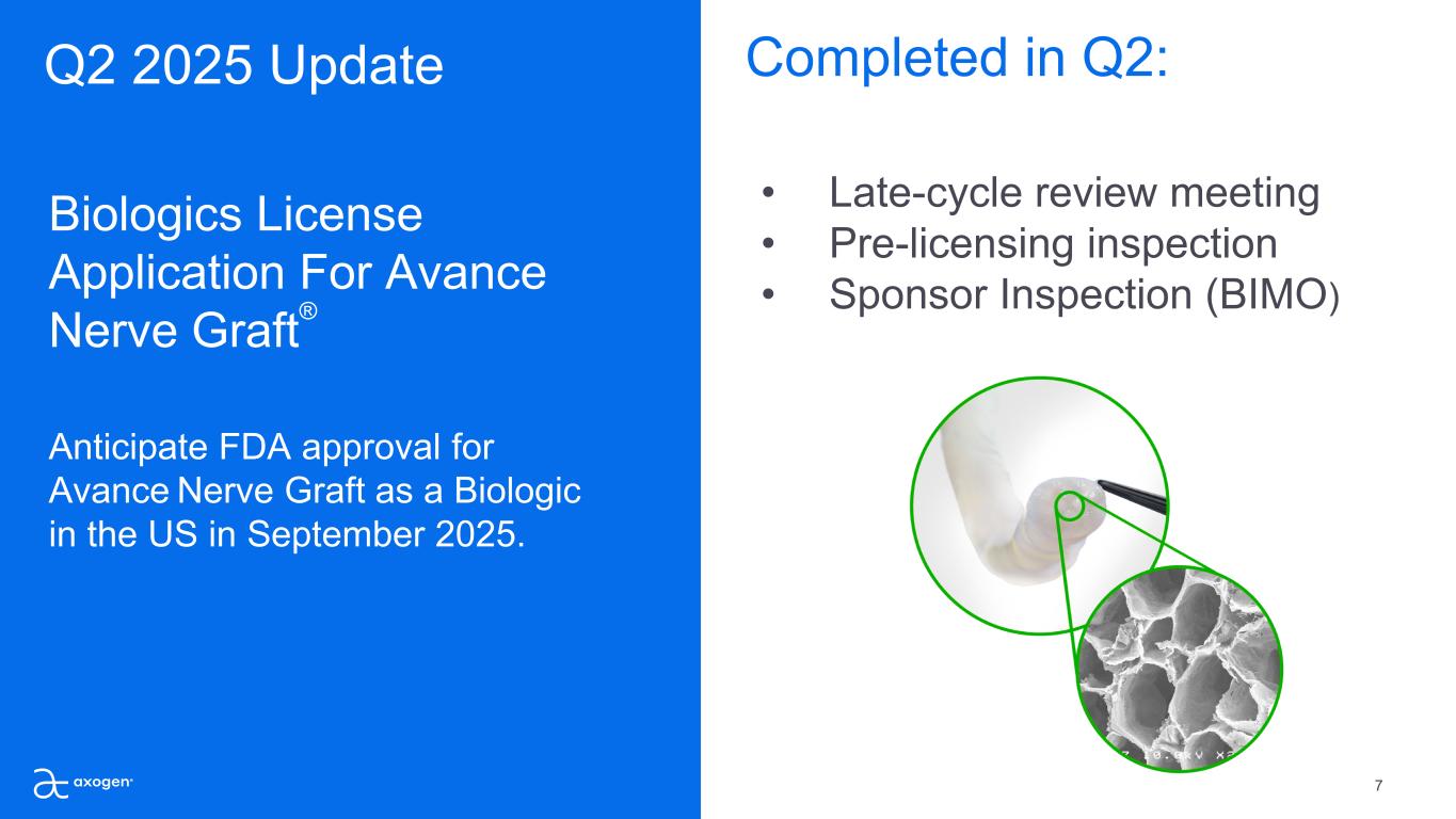 6 Clinical Research • Level 1 study protocol for implant based neurotization • Level 1 Avance® vs. Autograft evidence plan in mixed & motor nerves. • OMF/H&N clinical evidence plan Innovation • Therapeutic reconstruction • Ease of coaptation • Protection expansion Prostate Clinical & Market Development • Over 300 peer-reviewed articles, +17 in Q2 • ~10M est. additional covered lives added in Q2 via BCBS policy changes; ~17M est. new lives YTD Standard of Care • 6 active pilot sites; +3 in Q2 (Goal of 10 by YE) • Procedures underway • Goal of 100 procedures by year-end • Clinical development team hired 2025 Q2 Key Metrics Update Q2 2025 Recent Business Highlights