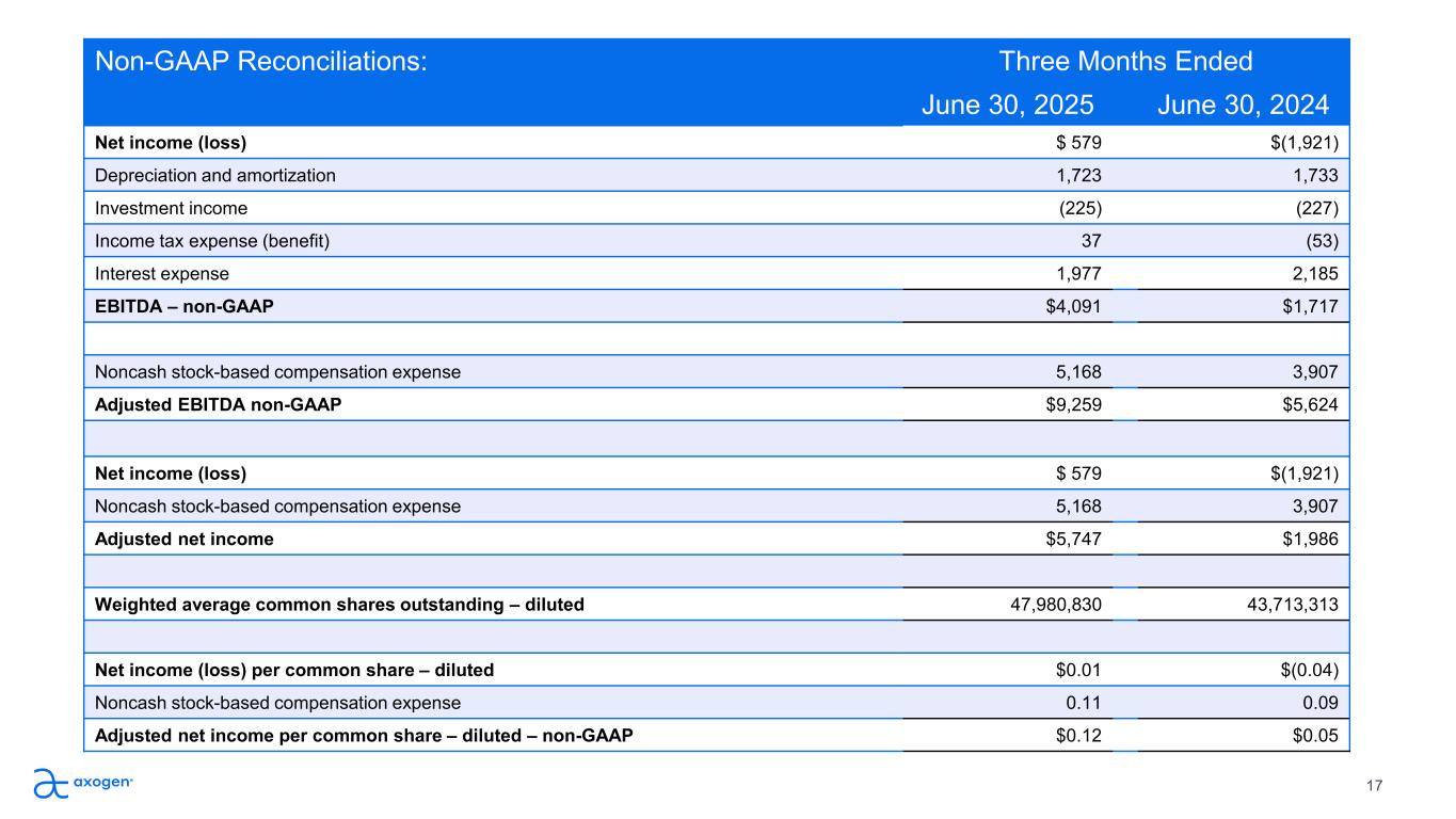 17 Non-GAAP Reconciliations: Three Months Ended June 30, 2025 June 30, 2024 Net income (loss) $ 579 $(1,921) Depreciation and amortization 1,723 1,733 Investment income (225) (227) Income tax expense (benefit) 37 (53) Interest expense 1,977 2,185 EBITDA – non-GAAP $4,091 $1,717 Noncash stock-based compensation expense 5,168 3,907 Adjusted EBITDA non-GAAP $9,259 $5,624 Net income (loss) $ 579 $(1,921) Noncash stock-based compensation expense 5,168 3,907 Adjusted net income $5,747 $1,986 Weighted average common shares outstanding – diluted 47,980,830 43,713,313 Net income (loss) per common share – diluted $0.01 $(0.04) Noncash stock-based compensation expense 0.11 0.09 Adjusted net income per common share – diluted – non-GAAP $0.12 $0.05