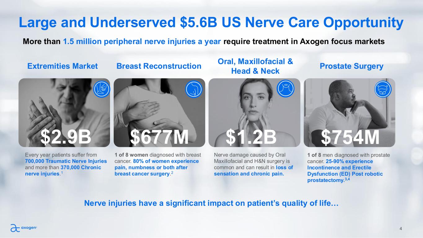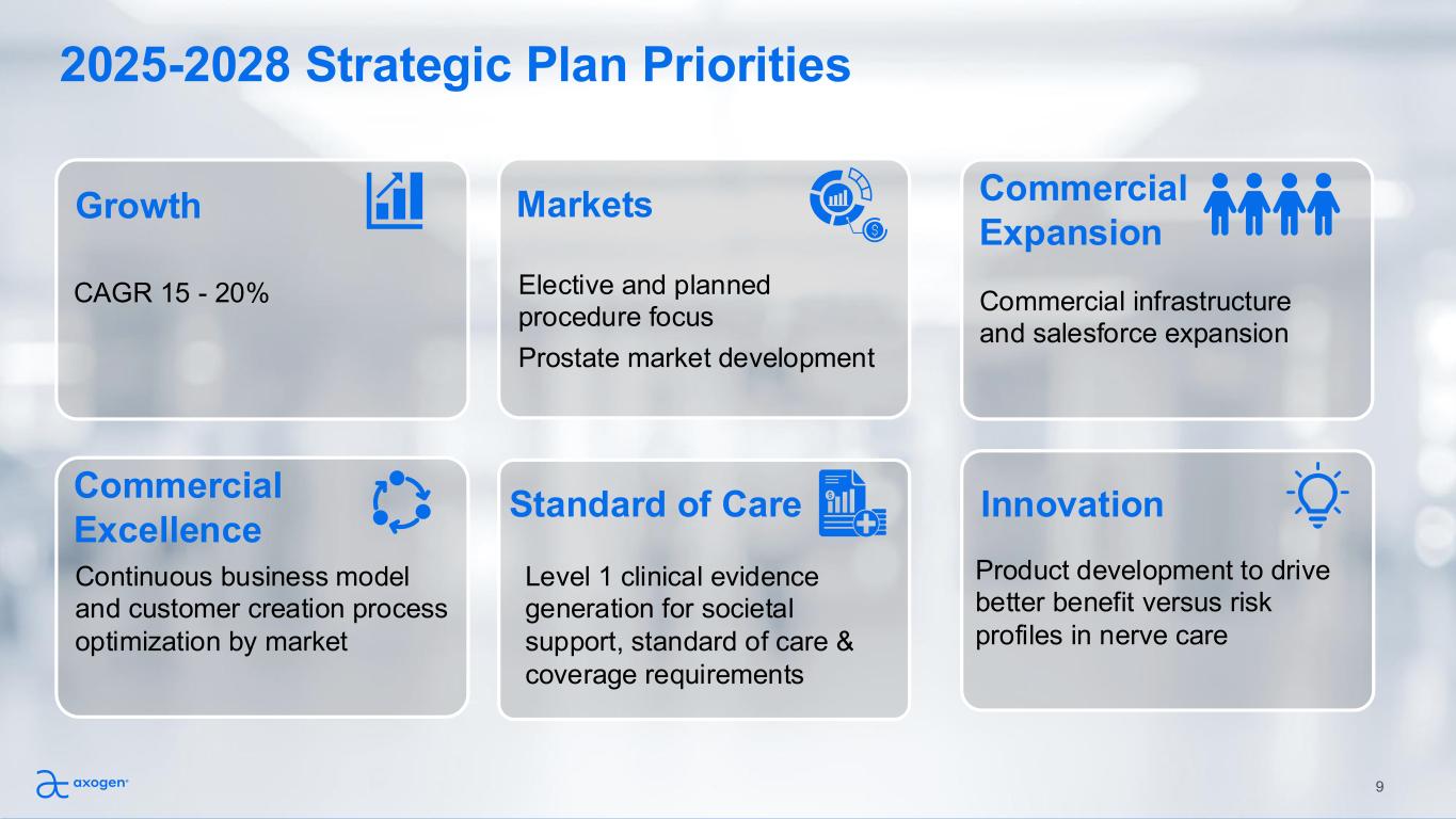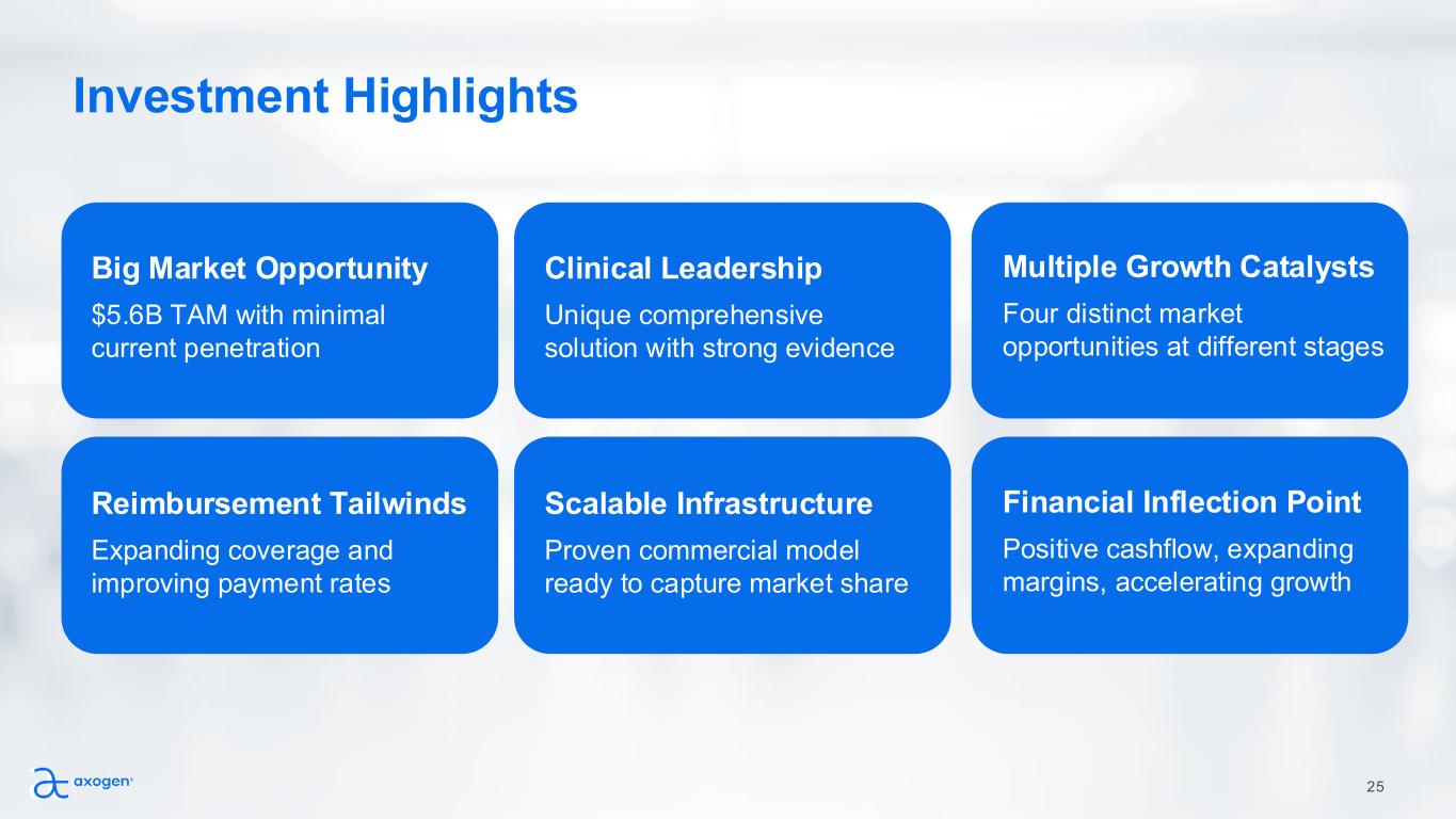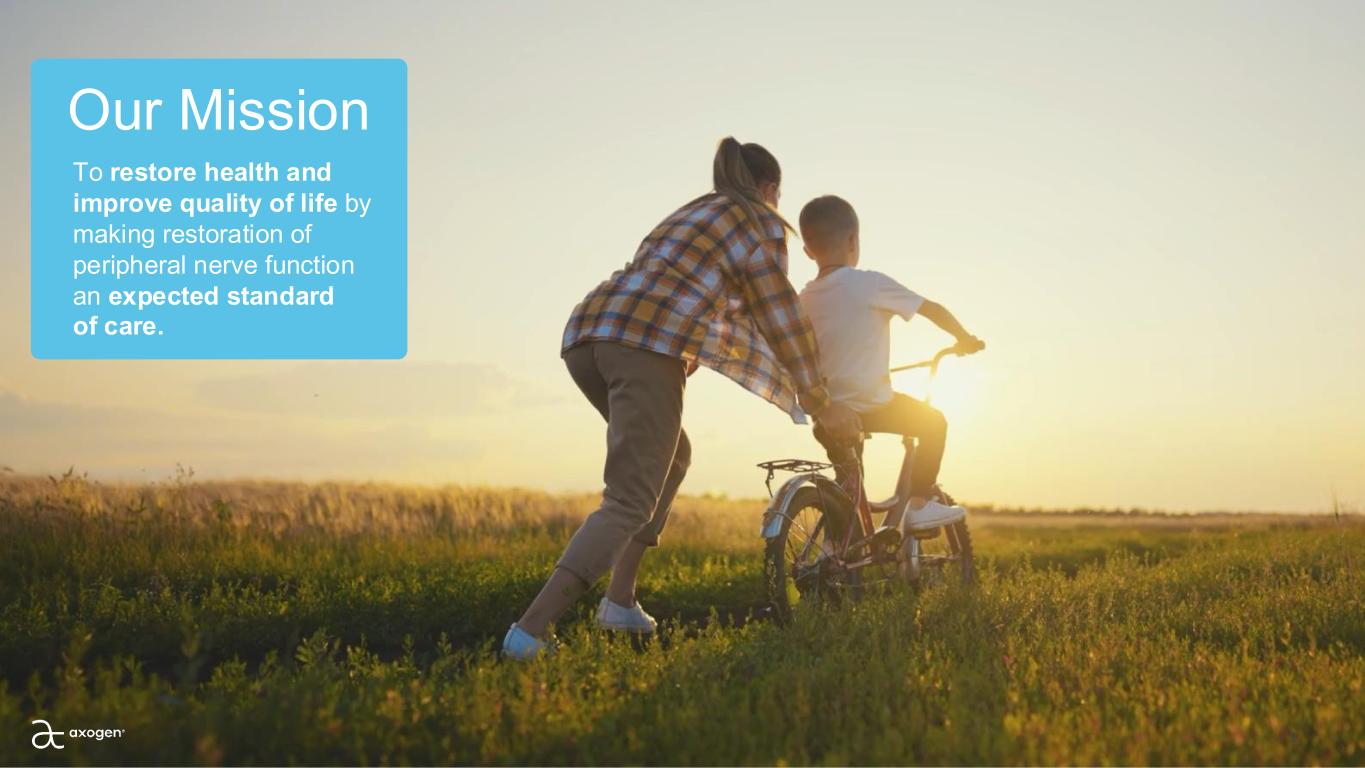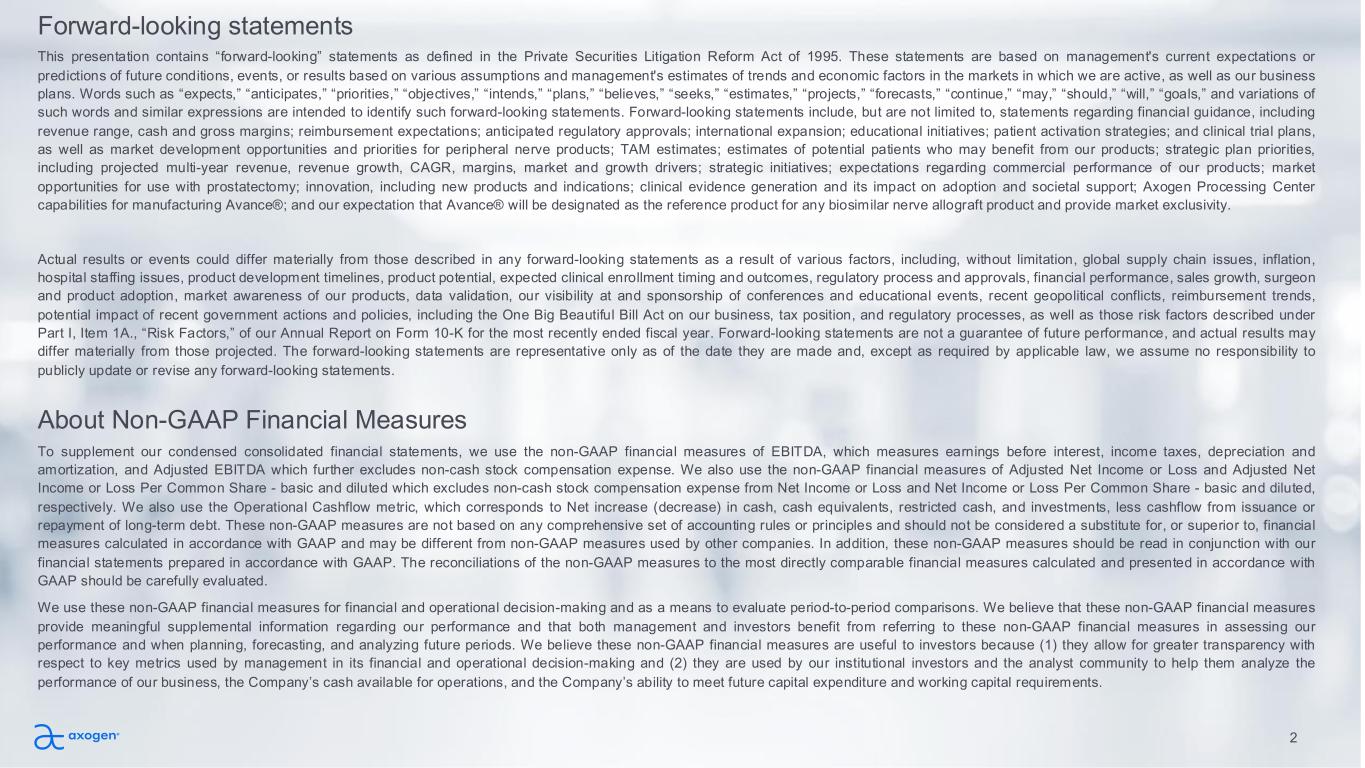 Forward-looking statements This presentation contains “forward-looking” statements as defined in the Private Securities Litigation Reform Act of 1995. These statements are based on management's current expectations or predictions of future conditions, events, or results based on various assumptions and management's estimates of trends and economic factors in the markets in which we are active, as well as our business plans. Words such as “expects,” “anticipates,” “priorities,” “objectives,” “intends,” “plans,” “believes,” “seeks,” “estimates,” “projects,” “forecasts,” “continue,” “may,” “should,” “will,” “goals,” and variations of such words and similar expressions are intended to identify such forward-looking statements. Forward-looking statements include, but are not limited to, statements regarding financial guidance, including revenue range, cash and gross margins; reimbursement expectations; anticipated regulatory approvals; international expansion; educational initiatives; patient activation strategies; and clinical trial plans, as well as market development opportunities and priorities for peripheral nerve products; TAM estimates; estimates of potential patients who may benefit from our products; strategic plan priorities, including projected multi-year revenue, revenue growth, CAGR, margins, market and growth drivers; strategic initiatives; expectations regarding commercial performance of our products; market opportunities for use with prostatectomy; innovation, including new products and indications; clinical evidence generation and its impact on adoption and societal support; Axogen Processing Center capabilities for manufacturing Avance®; and our expectation that Avance® will be designated as the reference product for any biosimilar nerve allograft product and provide market exclusivity. Actual results or events could differ materially from those described in any forward-looking statements as a result of various factors, including, without limitation, global supply chain issues, inflation, hospital staffing issues, product development timelines, product potential, expected clinical enrollment timing and outcomes, regulatory process and approvals, financial performance, sales growth, surgeon and product adoption, market awareness of our products, data validation, our visibility at and sponsorship of conferences and educational events, recent geopolitical conflicts, reimbursement trends, potential impact of recent government actions and policies, including the One Big Beautiful Bill Act on our business, tax position, and regulatory processes, as well as those risk factors described under Part I, Item 1A., “Risk Factors,” of our Annual Report on Form 10-K for the most recently ended fiscal year. Forward-looking statements are not a guarantee of future performance, and actual results may differ materially from those projected. The forward-looking statements are representative only as of the date they are made and, except as required by applicable law, we assume no responsibility to publicly update or revise any forward-looking statements. About Non-GAAP Financial Measures To supplement our condensed consolidated financial statements, we use the non-GAAP financial measures of EBITDA, which measures earnings before interest, income taxes, depreciation and amortization, and Adjusted EBITDA which further excludes non-cash stock compensation expense. We also use the non-GAAP financial measures of Adjusted Net Income or Loss and Adjusted Net Income or Loss Per Common Share - basic and diluted which excludes non-cash stock compensation expense from Net Income or Loss and Net Income or Loss Per Common Share - basic and diluted, respectively. We also use the Operational Cashflow metric, which corresponds to Net increase (decrease) in cash, cash equivalents, restricted cash, and investments, less cashflow from issuance or repayment of long-term debt. These non-GAAP measures are not based on any comprehensive set of accounting rules or principles and should not be considered a substitute for, or superior to, financial measures calculated in accordance with GAAP and may be different from non-GAAP measures used by other companies. In addition, these non-GAAP measures should be read in conjunction with our financial statements prepared in accordance with GAAP. The reconciliations of the non-GAAP measures to the most directly comparable financial measures calculated and presented in accordance with GAAP should be carefully evaluated. We use these non-GAAP financial measures for financial and operational decision-making and as a means to evaluate period-to-period comparisons. We believe that these non-GAAP financial measures provide meaningful supplemental information regarding our performance and that both management and investors benefit from referring to these non-GAAP financial measures in assessing our performance and when planning, forecasting, and analyzing future periods. We believe these non-GAAP financial measures are useful to investors because (1) they allow for greater transparency with respect to key metrics used by management in its financial and operational decision-making and (2) they are used by our institutional investors and the analyst community to help them analyze the performance of our business, the Company’s cash available for operations, and the Company’s ability to meet future capital expenditure and working capital requirements. 2