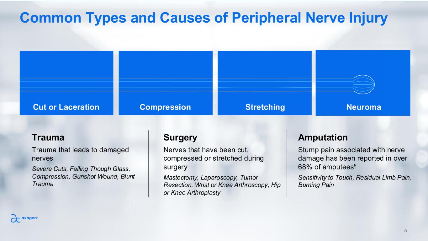 4 Large and Underserved $5.6B US Nerve Care Opportunity More than 1.5 million peripheral nerve injuries a year require treatment in Axogen focus markets Extremities Market Every year patients suffer from 700,000 Traumatic Nerve Injuries and more than 370,000 Chronic nerve injuries.1 Breast Reconstruction 1 of 8 women diagnosed with breast cancer. 80% of women experience pain, numbness or both after breast cancer surgery.2 Oral, Maxillofacial & Head & Neck Nerve damage caused by Oral Maxillofacial and H&N surgery is common and can result in loss of sensation and chronic pain. Prostate Surgery $1.2B$677M $754M Nerve injuries have a significant impact on patient’s quality of life… 1 of 8 men diagnosed with prostate cancer. 25-90% experience Incontinence and Erectile Dysfunction (ED) Post robotic prostatectomy.3,4 $2.9B