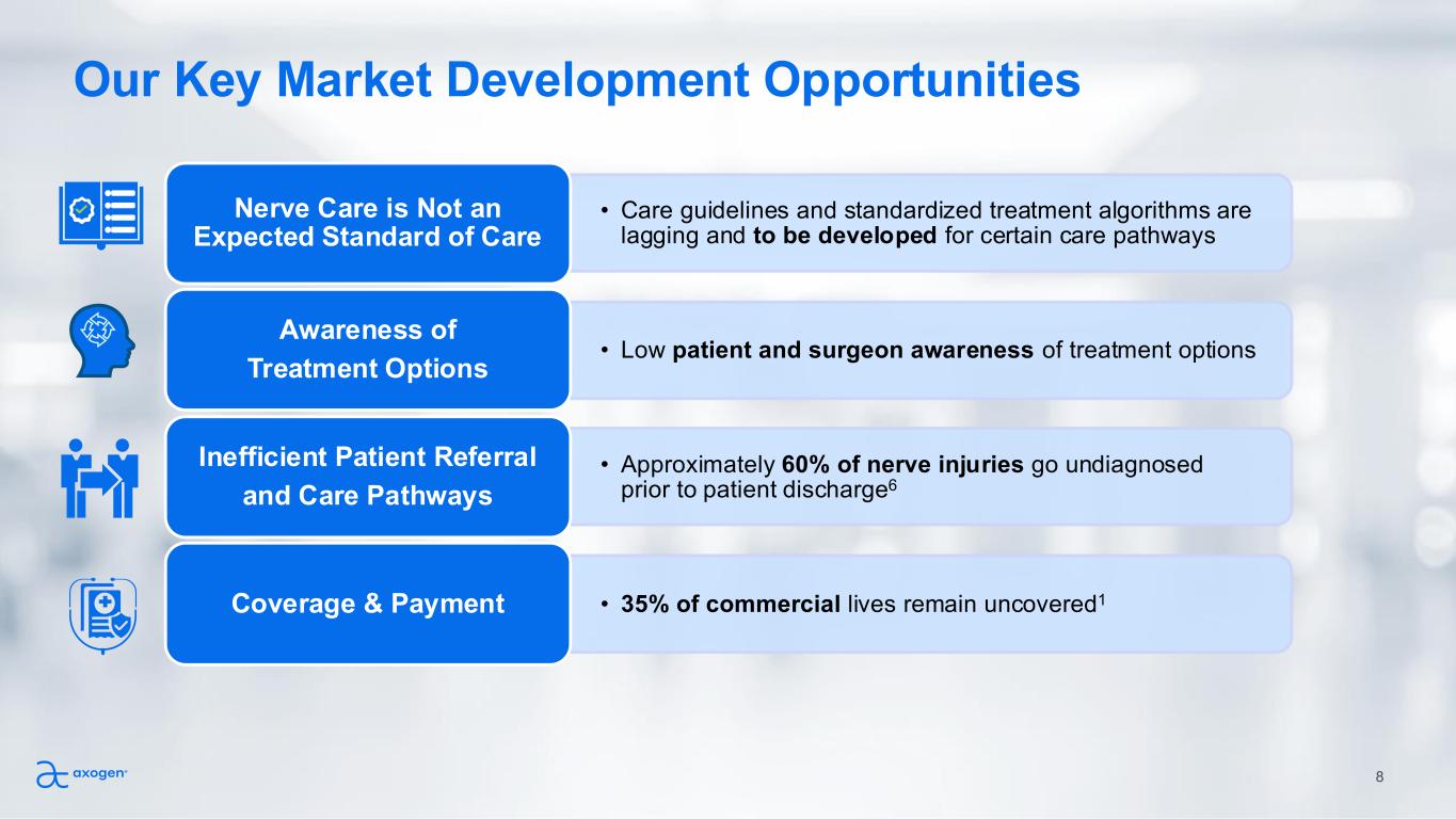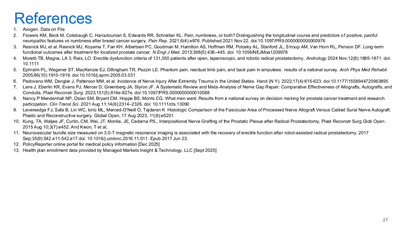 References 1. Axogen. Data on File 2. Flowers KM, Beck M, Colebaugh C, Haroutounian S, Edwards RR, Schreiber KL. Pain, numbness, or both? Distinguishing the longitudinal course and predictors o f positive, painful neuropathic features vs numbness after breast cancer surgery. Pain Rep. 2021;6(4):e976. Published 2021 Nov 22. doi:10.1097/PR9.0000000000000976 3. Resnick MJ, et al. Resnick MJ, Koyama T, Fan KH, Albertsen PC, Goodman M, Hamilton AS, Hoffman RM, Potosky AL, Stanford JL, S troup AM, Van Horn RL, Penson DF. Long-term functional outcomes after treatment for localized prostate cancer. N Engl J Med. 2013;368(5):436–445. doi: 10.1056/NEJMoa1209978 4. Moretti TB, Magna, LA 3, Reis, LO. Erectile dysfunction criteria of 131,350 patients after open, laparoscopic, and robotic radical prostatectomy. Andrology 2024 Nov;12(8):1865-1871. doi: 10.1111 5. Ephraim PL, Wegener ST, MacKenzie EJ, Dillingham TR, Pezzin LE. Phantom pain, residual limb pain, and back pain in amputees: results of a national survey. Arch Phys Med Rehabil. 2005;86(10):1910-1919. doi:10.1016/j.apmr.2005.03.031 6. Padovano WM, Dengler J, Patterson MM, et al. Incidence of Nerve Injury After Extremity Trauma in the United States. Hand (N Y). 2022;17(4):615-623. doi:10.1177/1558944720963895 7. Lans J, Eberlin KR, Evans PJ, Mercer D, Greenberg JA, Styron JF. A Systematic Review and Meta-Analysis of Nerve Gap Repair: Comparative Effectiveness of Allografts, Autografts, and Conduits. Plast Reconstr Surg. 2023;151(5):814e-827e. doi:10.1097/PRS.0000000000010088 8. Nancy P Mendenhall NP, Osian SM, Bryant CM, Hoppe BS, Morris CG. What men want: Results from a national survey on decision making for prostate cancer treatment and research participation. Clin Transl Sci. 2021 Aug 11;14(6):2314–2326. doi: 10.1111/cts.13090 9. Leversedge FJ, Safa B, Lin WC, Iorio ML, Merced-O'Neill O, Tajdaran K Histologic Comparison of the Fascicular Area of Processed Nerve Allograft Versus Cabled Sural Nerve Autograft. Plastic and Reconstructive surgery. Global Open, 17 Aug 2023, 11(8):e5201 10. Kung, TA, Waljee JF, Curtin, CM, Wei, JT, Montie, JE, Cederna PS., Interpositional Nerve Grafting of the Prostatic Plexus after Radical Prostatectomy, Plast Reconstr Surg Glob Open . 2015 Aug 10;3(7):e452. And Kwon, T et al, 11. Neurovascular bundle size measured on 3.0-T magnetic resonance imaging is associated with the recovery of erectile function after robot-assisted radical prostatectomy. 2017 Sep;35(9):542.e11-542.e17.doi: 10.1016/j.urolonc.2016.11.011. Epub 2017 Jun 23. 12. PolicyReporter online portal for medical policy information [Dec 2025] 13. Health plan enrollment data provided by Managed Markets Insight & Technology, LLC [Sept 2025] 27