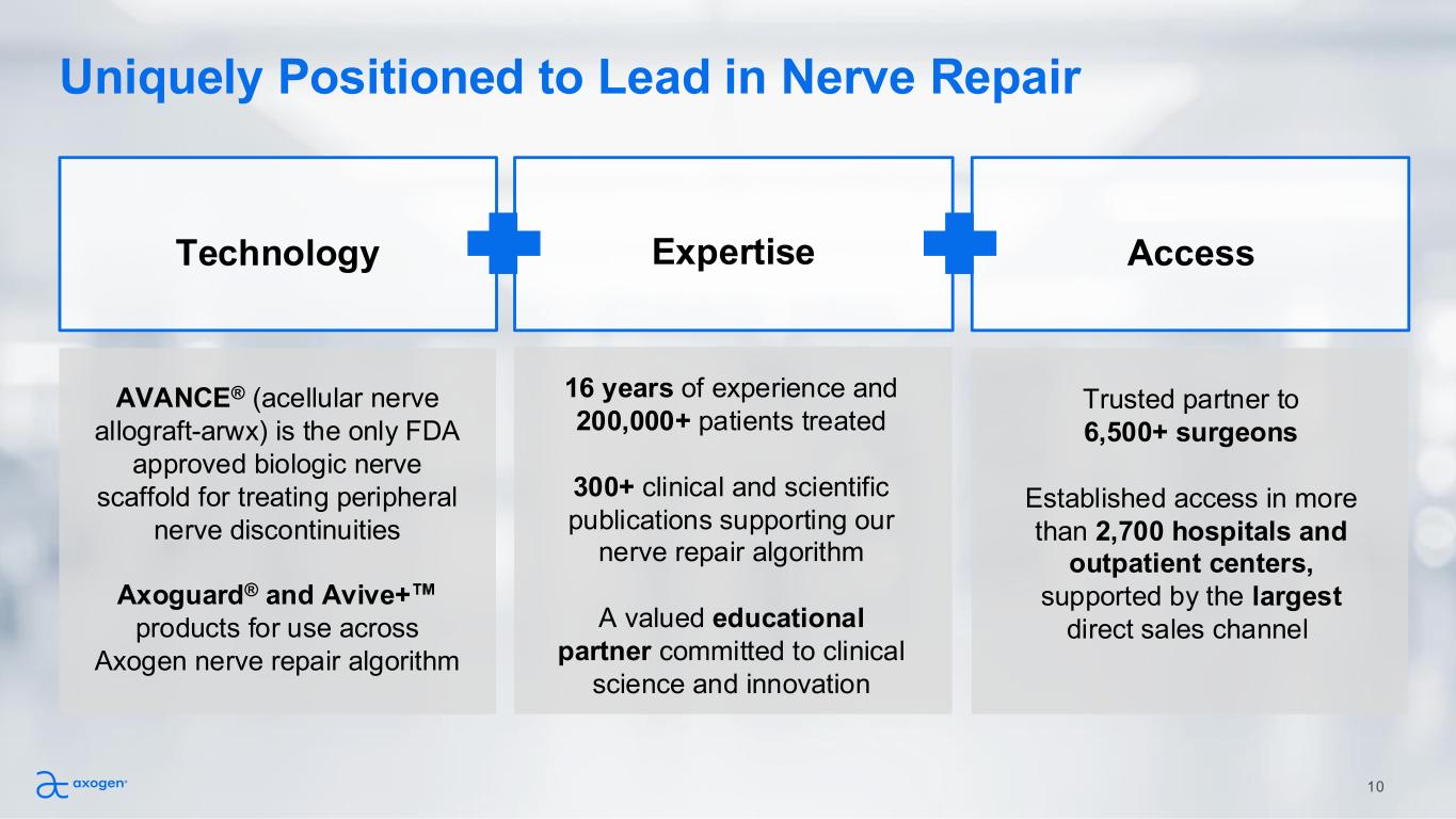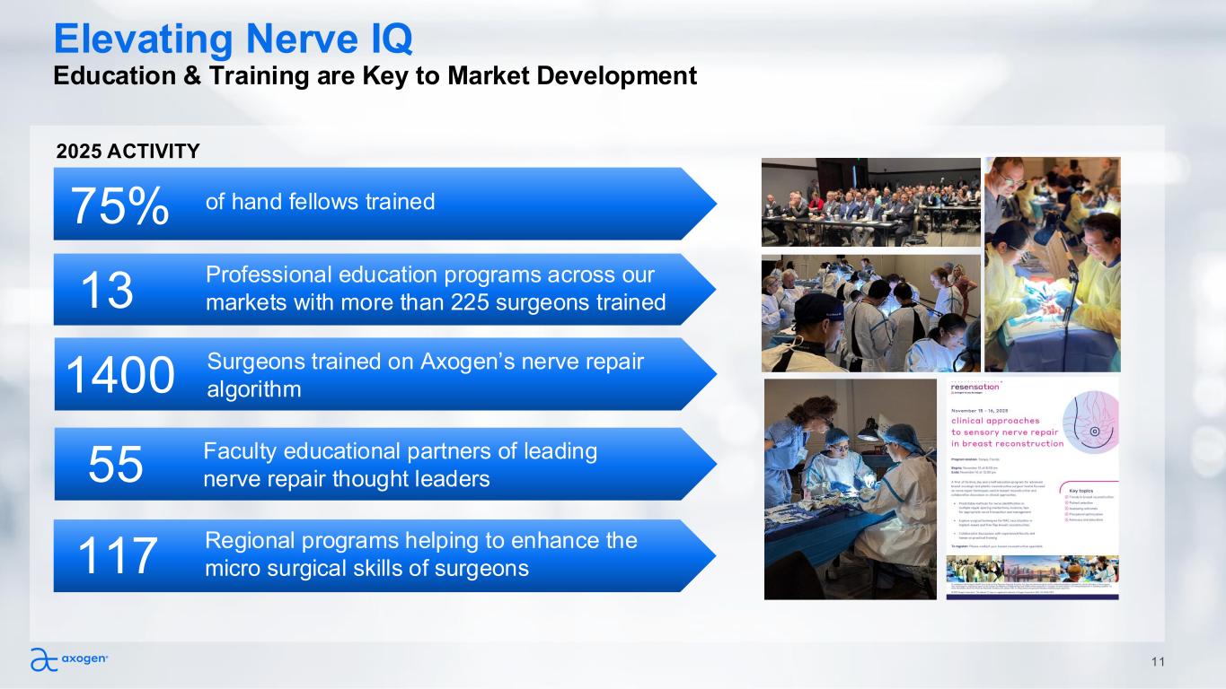 Uniquely Positioned to Lead in Nerve Repair AVANCE® (acellular nerve allograft-arwx) is the only FDA approved biologic nerve scaffold for treating peripheral nerve discontinuities Axoguard® and Avive+ products for use across Axogen nerve repair algorithm 16 years of experience and 200,000+ patients treated 300+ clinical and scientific publications supporting our nerve repair algorithm A valued educational partner committed to clinical science and innovation Trusted partner to 6,500+ surgeons Established access in more than 2,700 hospitals and outpatient centers, supported by the largest direct sales channel Technology Expertise Access 10