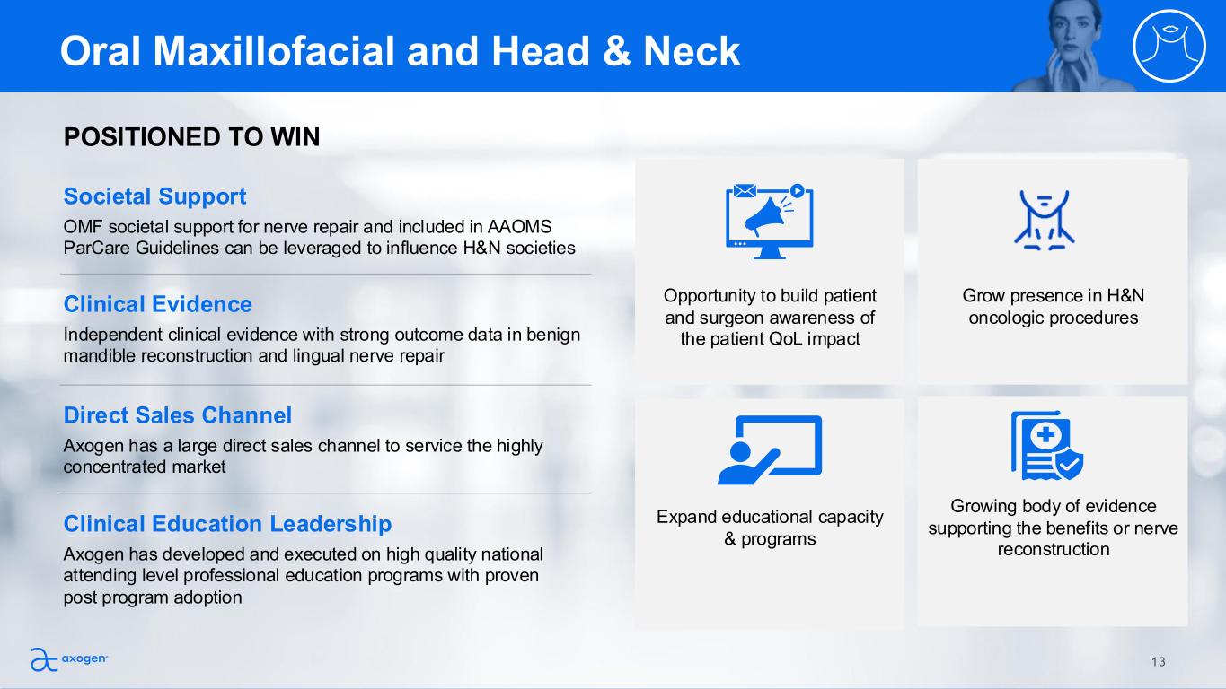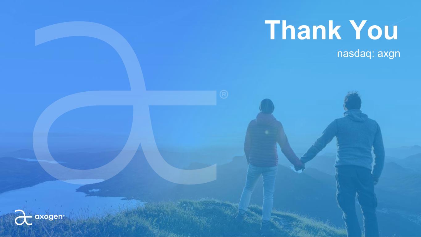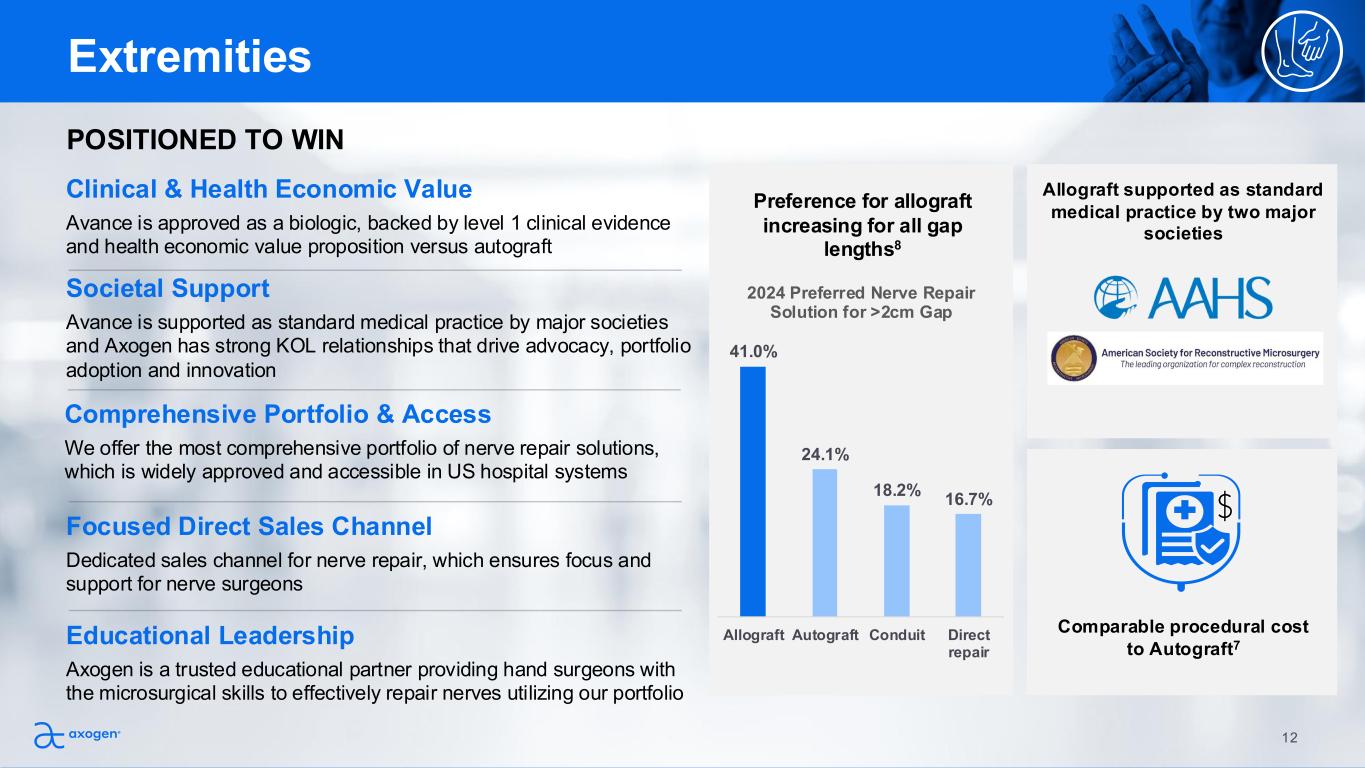 Societal Support Avance is supported as standard medical practice by major societies and Axogen has strong KOL relationships that drive advocacy, portfolio adoption and innovation POSITIONED TO WIN Preference for allograft increasing for all gap lengths8 Comparable procedural cost to Autograft7 Allograft supported as standard medical practice by two major societies Educational Leadership Axogen is a trusted educational partner providing hand surgeons with the microsurgical skills to effectively repair nerves utilizing our portfolio Comprehensive Portfolio & Access We offer the most comprehensive portfolio of nerve repair solutions, which is widely approved and accessible in US hospital systems Focused Direct Sales Channel Dedicated sales channel for nerve repair, which ensures focus and support for nerve surgeons Clinical & Health Economic Value Avance is approved as a biologic, backed by level 1 clinical evidence and health economic value proposition versus autograft Extremities 41.0% 24.1% 18.2% 16.7% Allograft Autograft Conduit Direct repair 2024 Preferred Nerve Repair Solution for >2cm Gap 12