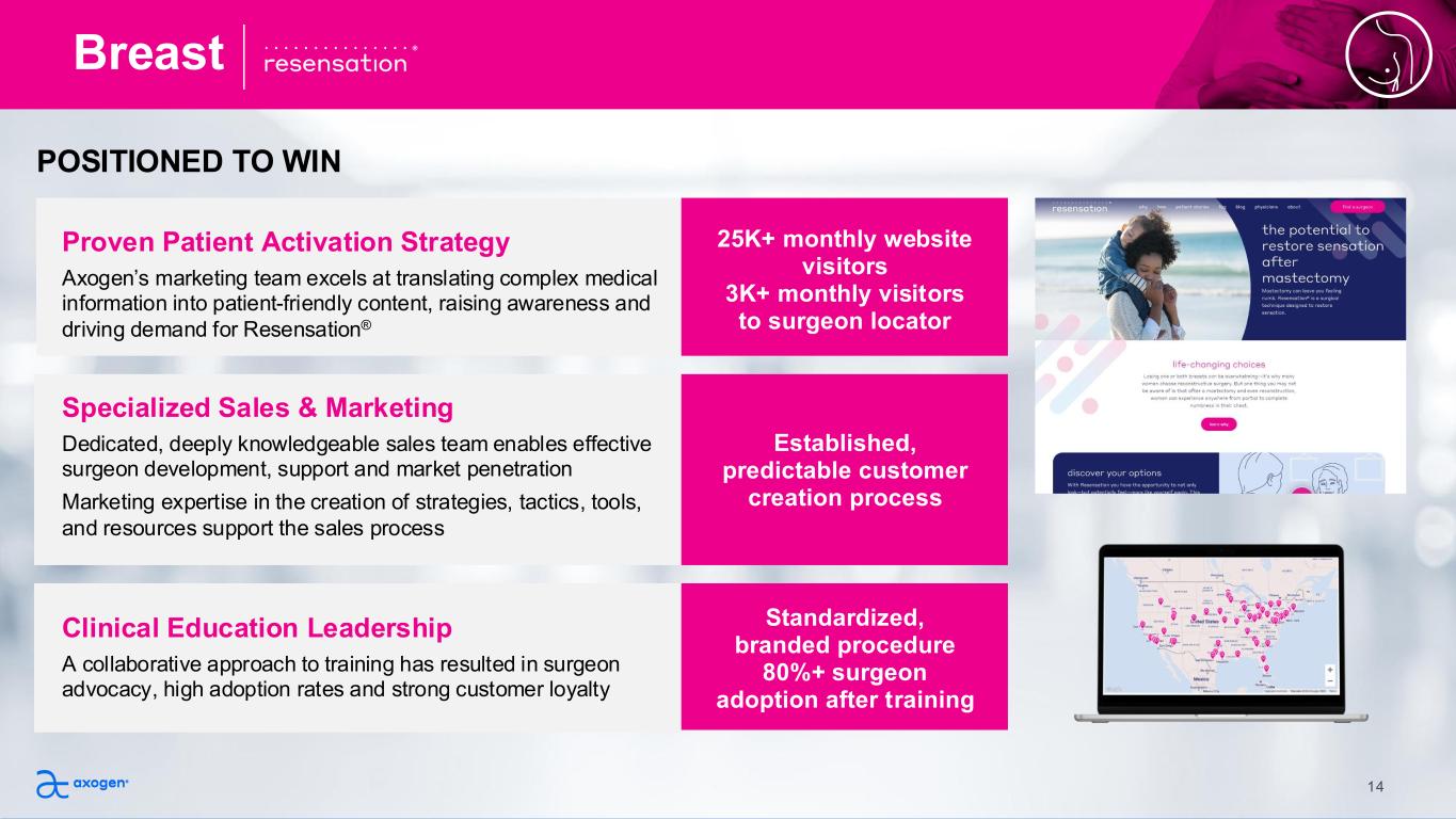 POSITIONED TO WIN Growing body of evidence supporting the benefits or nerve reconstruction Grow presence in H&N oncologic procedures Opportunity to build patient and surgeon awareness of the patient QoL impact Expand educational capacity & programs Societal Support OMF societal support for nerve repair and included in AAOMS ParCare Guidelines can be leveraged to influence H&N societies Clinical Education Leadership Axogen has developed and executed on high quality national attending level professional education programs with proven post program adoption Clinical Evidence Independent clinical evidence with strong outcome data in benign mandible reconstruction and lingual nerve repair Direct Sales Channel Axogen has a large direct sales channel to service the highly concentrated market Oral Maxillofacial and Head & Neck 13