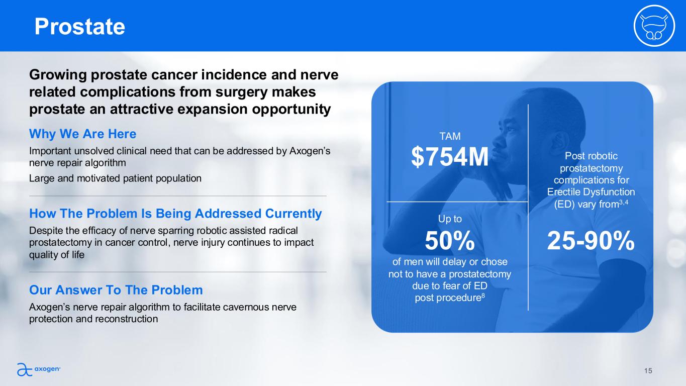 Oral Maxillofacial and Head & Neck $754M TAM of men will delay or chose not to have a prostatectomy due to fear of ED post procedure8 Prostate 50% Up to Post robotic prostatectomy complications for Erectile Dysfunction (ED) vary from3,4 25-90% Why We Are Here Important unsolved clinical need that can be addressed by Axogen’s nerve repair algorithm Large and motivated patient population Our Answer To The Problem Axogen’s nerve repair algorithm to facilitate cavernous nerve protection and reconstruction How The Problem Is Being Addressed Currently Despite the efficacy of nerve sparring robotic assisted radical prostatectomy in cancer control, nerve injury continues to impact quality of life Growing prostate cancer incidence and nerve related complications from surgery makes prostate an attractive expansion opportunity 15