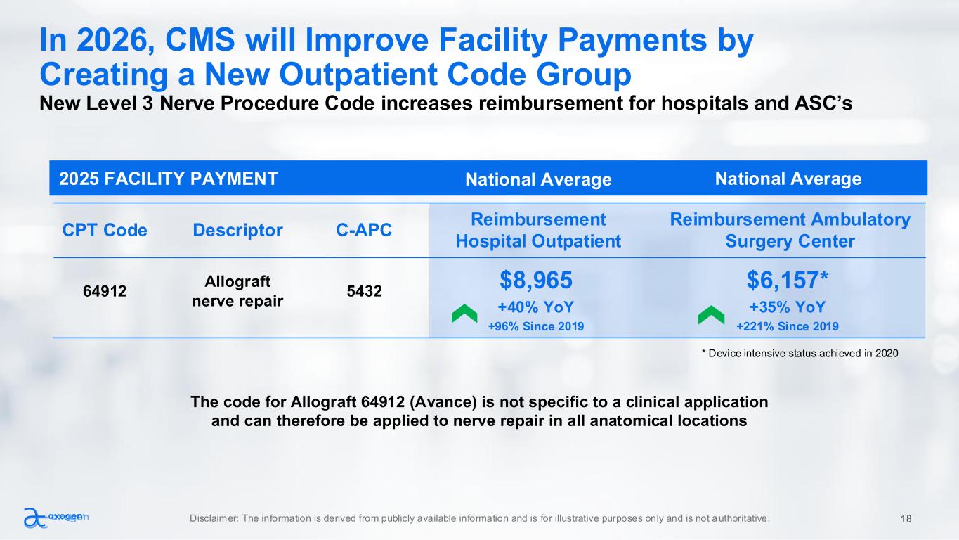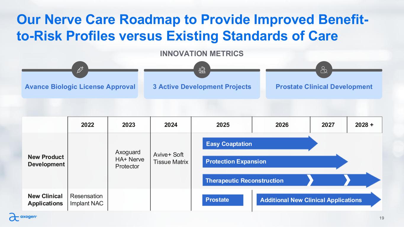National Average2025 FACILITY PAYMENT In 2026, CMS will Improve Facility Payments by Creating a New Outpatient Code Group New Level 3 Nerve Procedure Code increases reimbursement for hospitals and ASC’s The code for Allograft 64912 (Avance) is not specific to a clinical application and can therefore be applied to nerve repair in all anatomical locations CPT Code Descriptor C-APC Reimbursement Hospital Outpatient Reimbursement Ambulatory Surgery Center 64912 Allograft nerve repair 5432 $8,965 $6,157* +40% YoY +96% Since 2019 +35% YoY +221% Since 2019 National Average Disclaimer: The information is derived from publicly available information and is for illustrative purposes only and is not authoritative. 18 * Device intensive status achieved in 2020