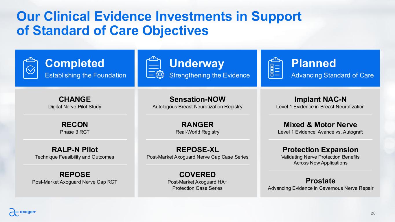 19 INNOVATION METRICS Avance Biologic License Approval 3 Active Development Projects Prostate Clinical Development 2022 2023 2024 2025 2026 2027 2028 + New Product Development Axoguard HA+ Nerve Protector Avive+ Soft Tissue Matrix New Clinical Applications Resensation Implant NAC Prostate Additional New Clinical Applications Our Nerve Care Roadmap to Provide Improved Benefit- to-Risk Profiles versus Existing Standards of Care Protection Expansion Easy Coaptation Therapeutic Reconstruction