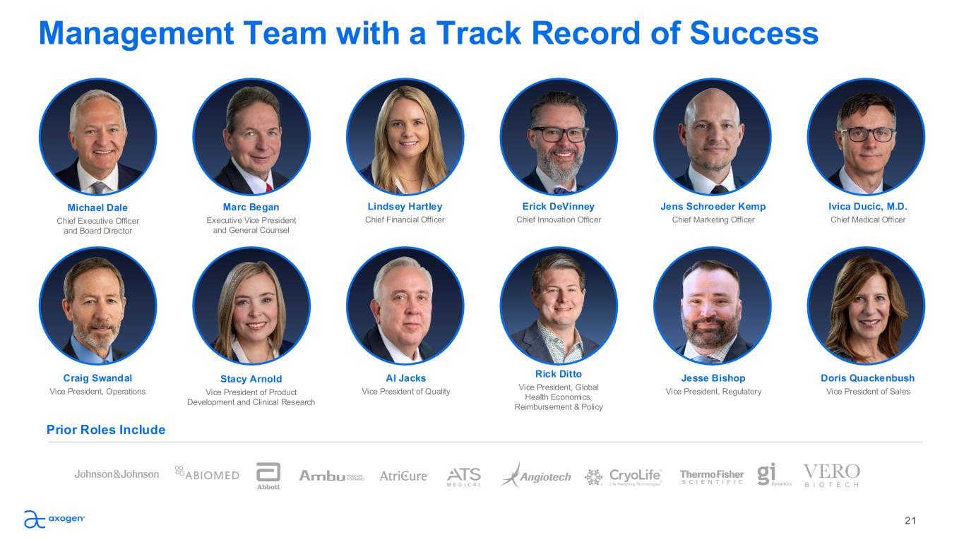 Management Team with a Track Record of Success Michael Dale Chief Executive Officer and Board Director Marc Began Executive Vice President and General Counsel Lindsey Hartley Chief Financial Officer Erick DeVinney Chief Innovation Officer Jens Schroeder Kemp Chief Marketing Officer Ivica Ducic, M.D. Chief Medical Officer Craig Swandal Vice President, Operations Stacy Arnold Vice President of Product Development and Clinical Research Al Jacks Vice President of Quality Rick Ditto Vice President, Global Health Economics, Reimbursement & Policy Doris Quackenbush Vice President of Sales Jesse Bishop Vice President, Regulatory Prior Roles Include 21