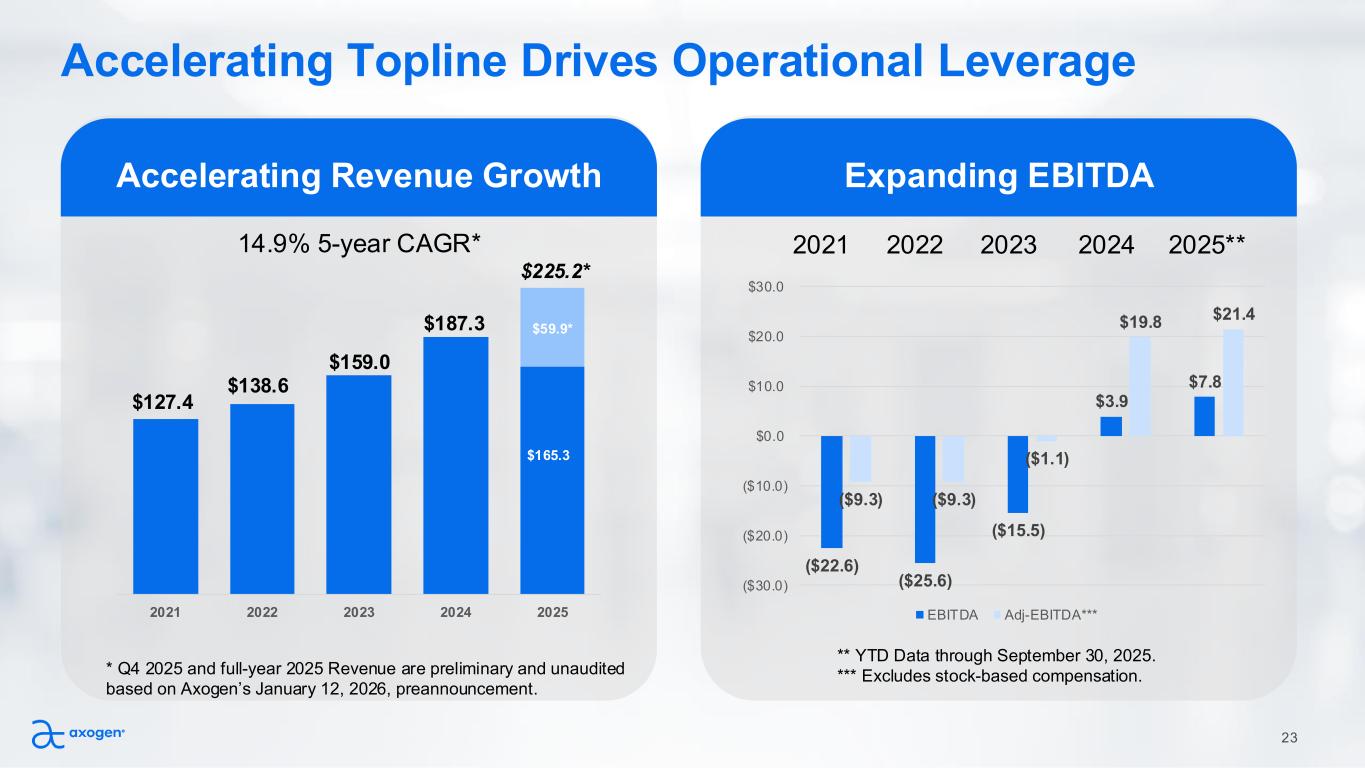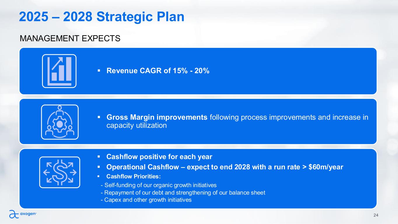 Accelerating Topline Drives Operational Leverage Accelerating Revenue Growth 23 Expanding EBITDA $59.9* 2021 2022 2023 2024 2025 $127.4 $138.6 $159.0 $187.3 $225.2* $165.3 * Q4 2025 and full-year 2025 Revenue are preliminary and unaudited based on Axogen’s January 12, 2026, preannouncement. ($22.6) ($25.6) ($15.5) $3.9 $7.8 ($9.3) ($9.3) ($1.1) $19.8 $21.4 ($30.0) ($20.0) ($10.0) $0.0 $10.0 $20.0 $30.0 EBITDA Adj-EBITDA*** 2021 2022 2023 2024 2025** ** YTD Data through September 30, 2025. *** Excludes stock-based compensation. 14.9% 5-year CAGR*
