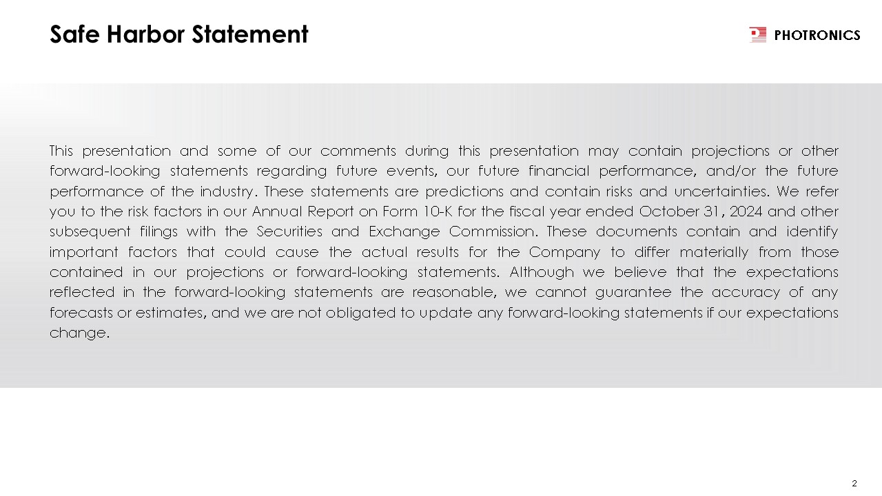 Safe Harbor Statement  This presentation and some of our comments during this presentation may contain projections or other forward-looking statements regarding future events, our future financial performance, and/or the future performance of the industry. These statements are predictions and contain risks and uncertainties. We refer you to the risk factors in our Annual Report on Form 10-K for the fiscal year ended October 31, 2024 and other subsequent filings with the Securities and Exchange Commission. These documents contain and identify important factors that could cause the actual results for the Company to differ materially from those contained in our projections or forward-looking statements. Although we believe that the expectations reflected in the forward-looking statements are reasonable, we cannot guarantee the accuracy of any forecasts or estimates, and we are not obligated to update any forward-looking statements if our expectations change.  2