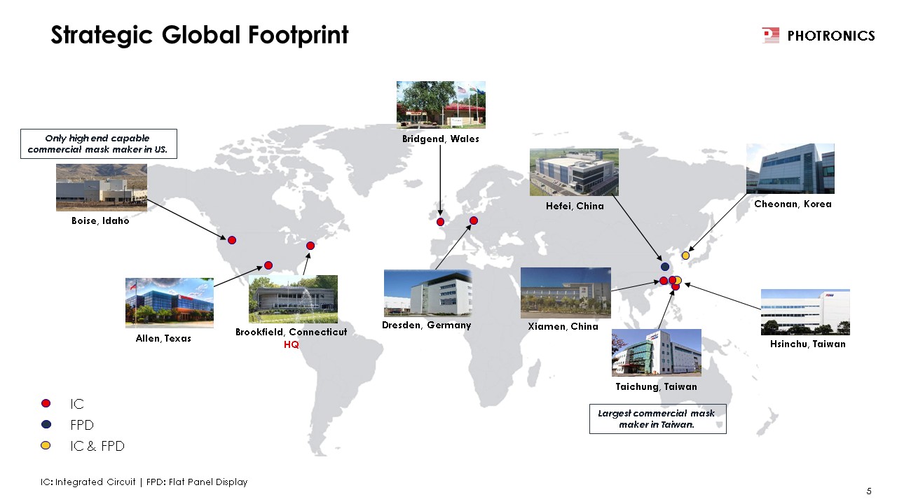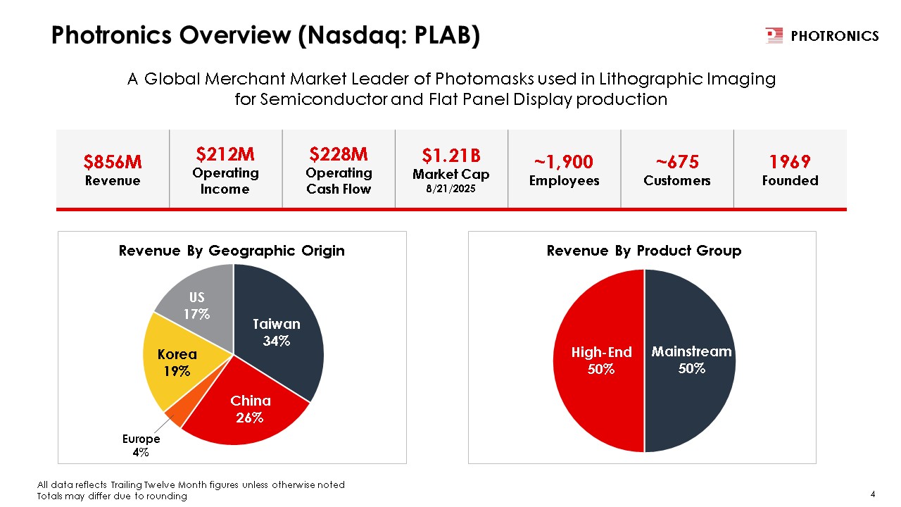 Europe  4%  Taiwan  34%  China  26%  Korea  19%  US  17%  Photronics Overview (Nasdaq: PLAB)  $856M  Revenue  $212M  Operating Income  $228M  Operating Cash Flow  $1.21B  Market Cap  8/21/2025  ~1,900  Employees  ~675  Customers  1969  Founded  A Global Merchant Market Leader of Photomasks used in Lithographic Imaging for Semiconductor and Flat Panel Display production  Revenue By Geographic Origin  33%  27%  18%  17%  5%  Revenue By Product Group  All data reflects Trailing Twelve Month figures unless otherwise noted  Totals may differ due to rounding  27%  47%  22%  4%  4  Mainstream  50%  High-End 50%