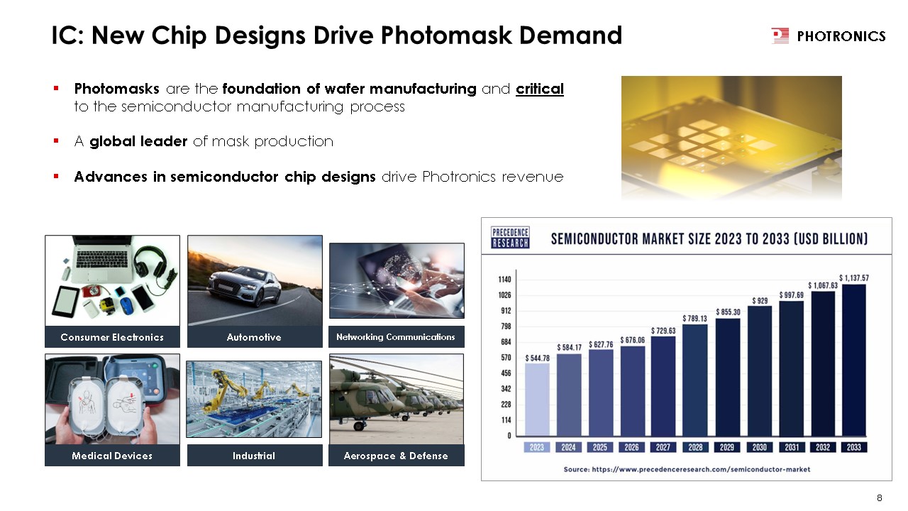 IC: New Chip Designs Drive Photomask Demand  Photomasks are the foundation of wafer manufacturing and critical to the semiconductor manufacturing process   A global leader of mask production  Advances in semiconductor chip designs drive Photronics revenue  Consumer Electronics  Medical Devices  8  Automotive  Industrial  Networking Communications  Aerospace & Defense