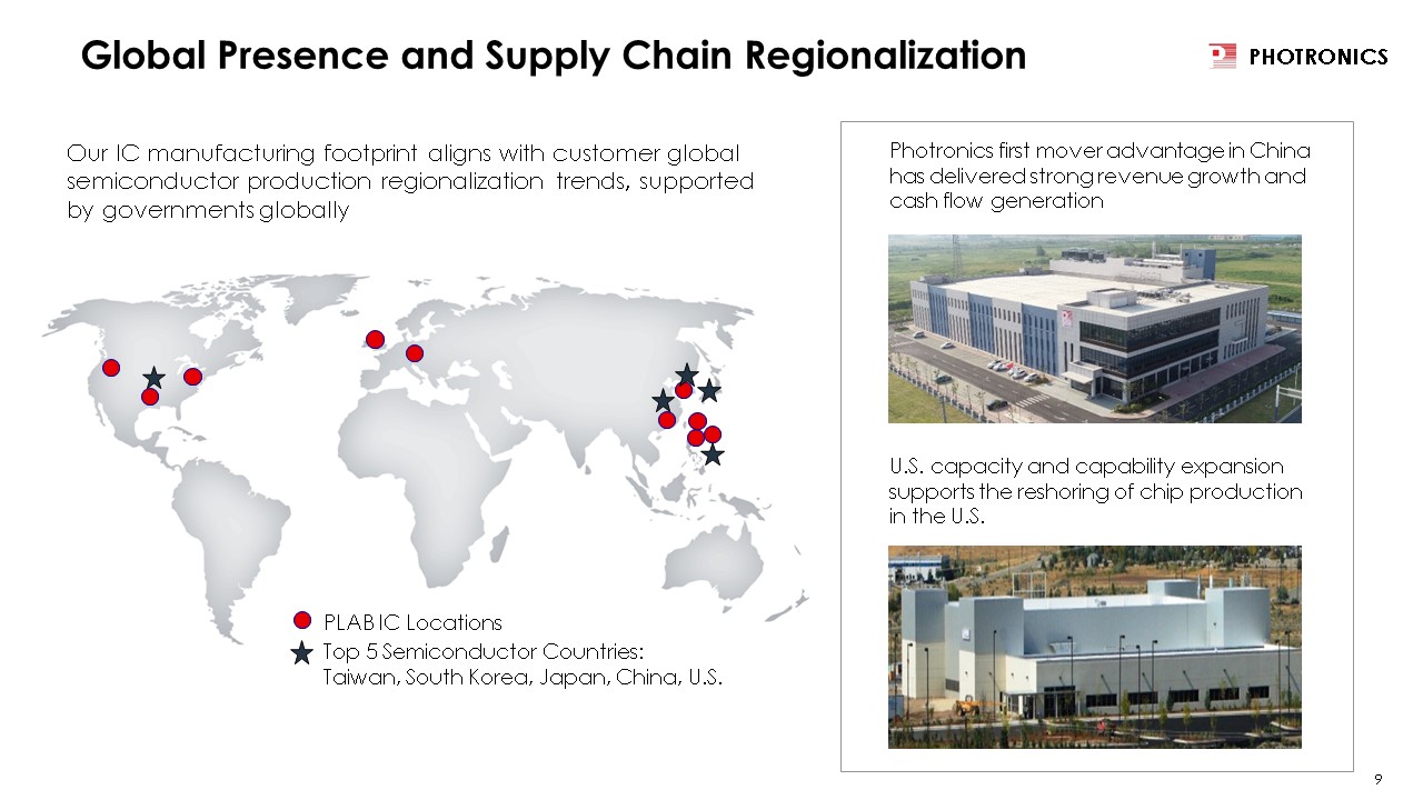 Global Presence and Supply Chain Regionalization  Our IC manufacturing footprint aligns with customer global semiconductor production regionalization trends, supported by governments globally  Photronics first mover advantage in China has delivered strong revenue growth and cash flow generation  U.S. capacity and capability expansion supports the reshoring of chip production in the U.S.  PLAB IC Locations  Top 5 Semiconductor Countries:Taiwan, South Korea, Japan, China, U.S.  9