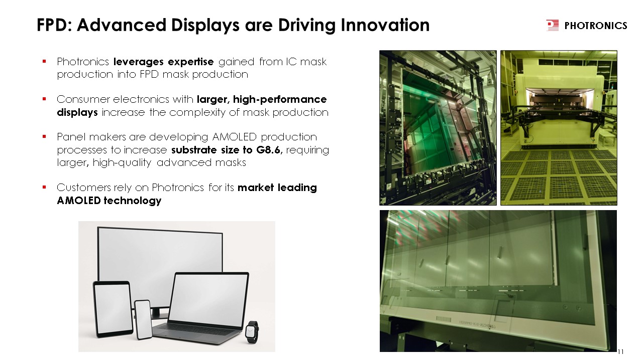 FPD: Advanced Displays are Driving Innovation   Photronics leverages expertise gained from IC mask production into FPD mask production  Consumer electronics with larger, high-performance displays increase the complexity of mask production  Panel makers are developing AMOLED production processes to increase substrate size to G8.6, requiring larger, high-quality advanced masks  Customers rely on Photronics for its market leading AMOLED technology  11