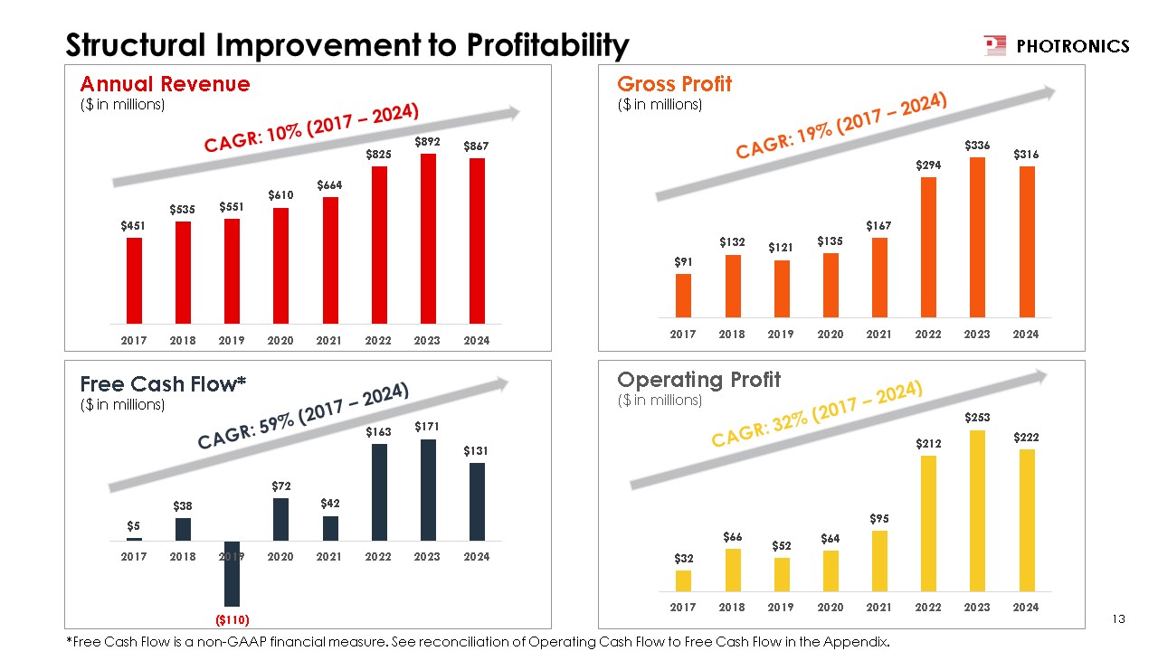Competitive Advantages  Global Footprint  Close to customer  Aligned with end markets  Flexible supply chain  Technology Leader  Process expertise  Advanced Process-of-Record  High barriers to entry  Commercial Excellence  Customer first  Trusted partner  Wafer yield enhancement  Technology roadmap enabler  Operational Excellence  Responsive delivery  High yields  Cost control  Supply chain optimization  Teamwork and execution  12