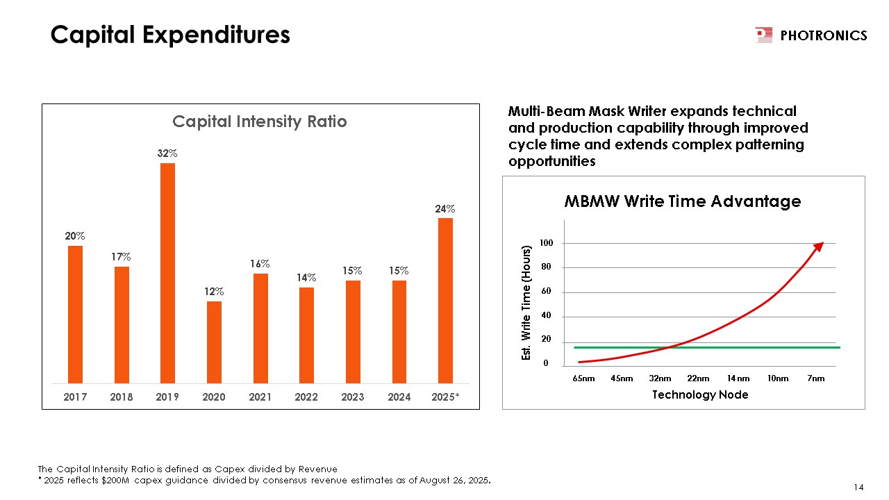 Capital Expenditures  The Capital Intensity Ratio is defined as Capex divided by Revenue  * 2025 reflects $200M capex guidance divided by consensus revenue estimates as of August 26, 2025.   Multi-Beam Mask Writer expands technical and production capability through improved cycle time and extends complex patterning opportunities  MBMW Write Time Advantage  Technology Node  100  80  60  40  20  0  Est. Write Time (Hours)  65nm 45nm 32nm 22nm 14 nm 10nm 7nm  14