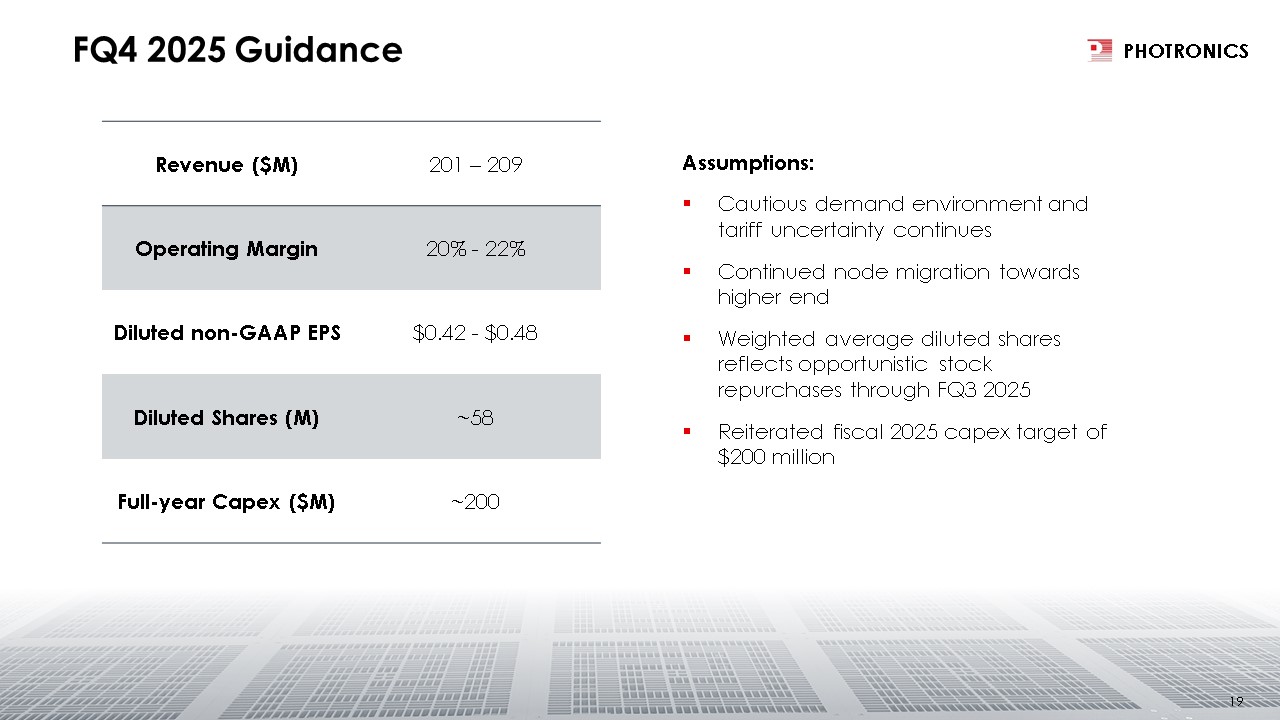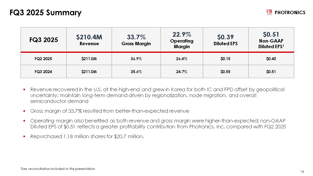 FQ3 2025 Summary  FQ3 2025  $210.4M  Revenue  33.7%  Gross Margin  22.9%  Operating Margin  $0.39  Diluted EPS  $0.51  Non-GAAP Diluted EPS1  FQ2 2025  $211.0M  36.9%  26.4%  $0.15  $0.40  FQ3 2024  $211.0M  35.6%  24.7%  $0.55  $0.51  1See reconciliation included in this presentation  16  Revenue recovered in the U.S. at the high-end and grew in Korea for both IC and FPD offset by geopolitical uncertainty; maintain long-term demand driven by regionalization, node migration, and overall semiconductor demand  Gross margin of 33.7% resulted from better-than-expected revenue  Operating margin also benefited as both revenue and gross margin were higher-than-expected; non-GAAP Diluted EPS of $0.51 reflects a greater profitability contribution from Photronics, Inc. compared with FQ2 2025  Repurchased 1.18 million shares for $20.7 million.