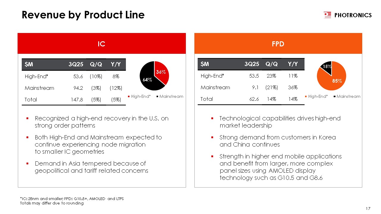 Revenue by Product Line  $M  3Q25  Q/Q  Y/Y  High-End*  53.6  (10%)  8%  Mainstream  94.2  (3%)  (12%)  Total  147.8  (5%)  (5%)  Recognized a high-end recovery in the U.S. on strong order patterns  Both High-End and Mainstream expected to continue experiencing node migration to smaller IC geometries  Demand in Asia tempered because of geopolitical and tariff related concerns  *IC: 28nm and smaller; FPD: G10.5+, AMOLED and LTPS   Totals may differ due to rounding  Technological capabilities drives high-end market leadership  Strong demand from customers in Korea and China continues  Strength in higher end mobile applications and benefit from larger, more complex panel sizes using AMOLED display technology such as G10.5 and G8.6  $M  3Q25  Q/Q  Y/Y  High-End*  53.5  23%  11%  Mainstream  9.1  (21%)  36%  Total  62.6  14%  14%  IC  FPD  17