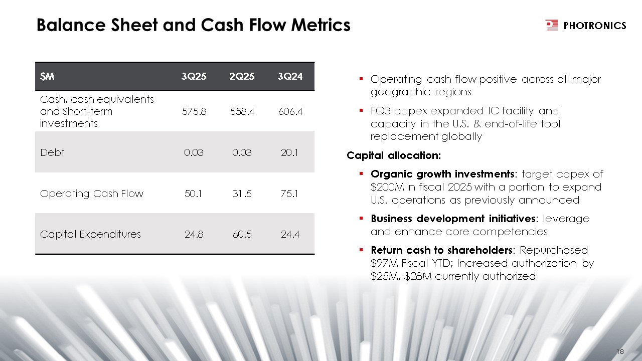 Operating cash flow positive across all major geographic regions  FQ3 capex expanded IC facility and capacity in the U.S. & end-of-life tool replacement globally  Capital allocation:  Organic growth investments: target capex of $200M in fiscal 2025 with a portion to expand U.S. operations as previously announced  Business development initiatives: leverage and enhance core competencies  Return cash to shareholders: Repurchased $97M Fiscal YTD; Increased authorization by $25M, $28M currently authorized  Balance Sheet and Cash Flow Metrics  $M  3Q25  2Q25  3Q24  Cash, cash equivalents and Short-term investments  575.8  558.4  606.4  Debt  0.03  0.03  20.1  Operating Cash Flow  50.1  31.5  75.1  Capital Expenditures  24.8  60.5  24.4  18