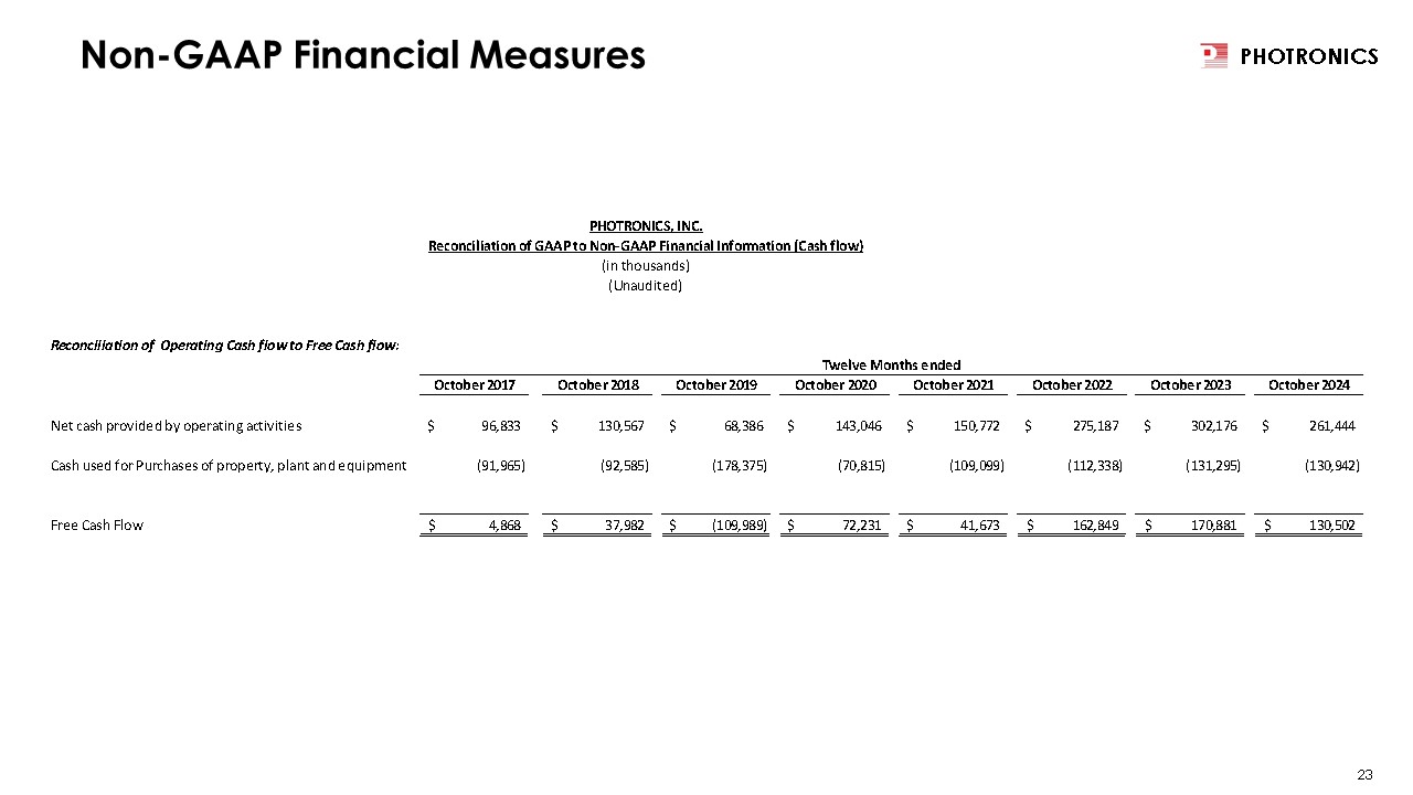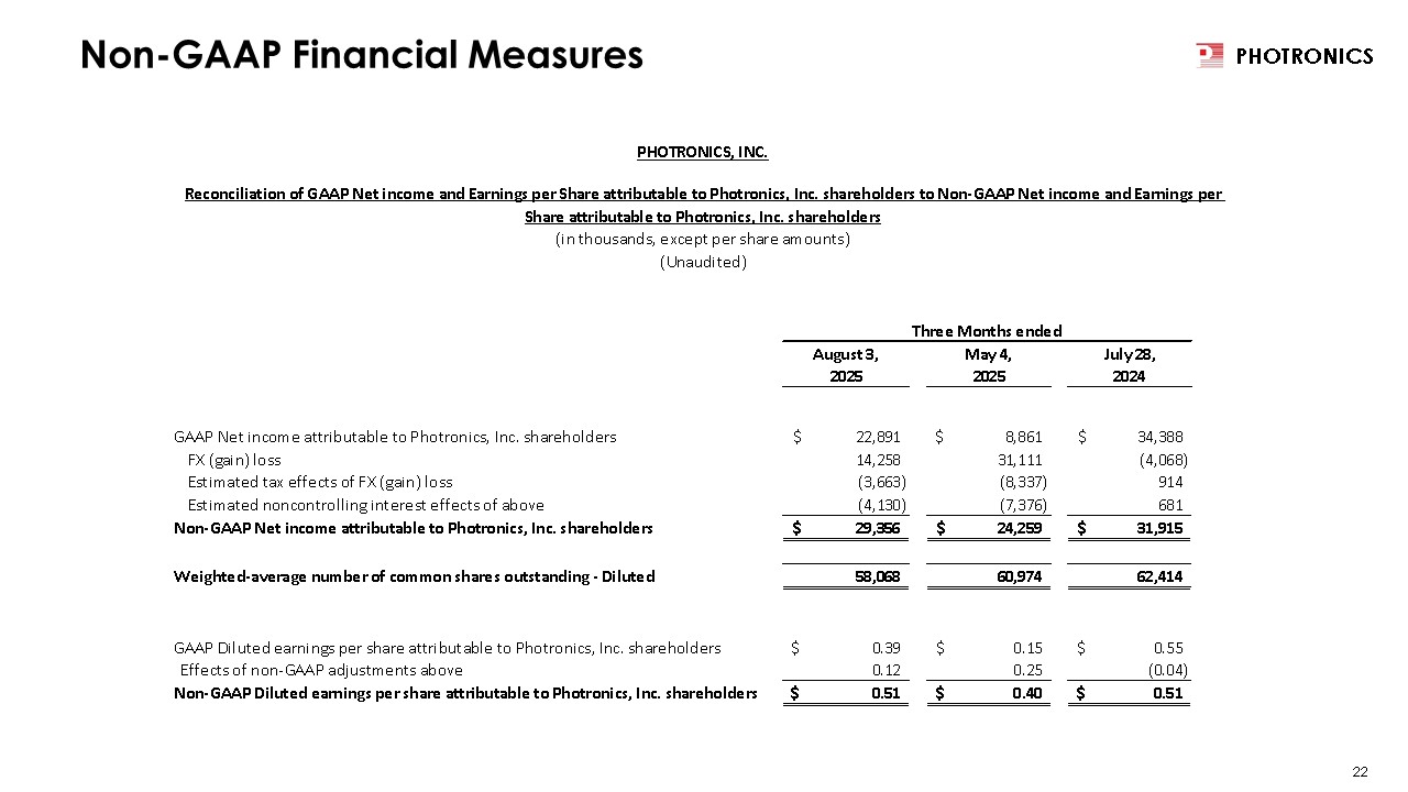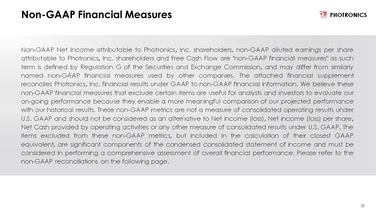 Non-GAAP Financial Measures  Non-GAAP Net Income attributable to Photronics, Inc. shareholders, non-GAAP diluted earnings per share attributable to Photronics, Inc. shareholders and Free Cash Flow are "non-GAAP financial measures" as such term is defined by Regulation G of the Securities and Exchange Commission, and may differ from similarly named non-GAAP financial measures used by other companies. The attached financial supplement reconciles Photronics, Inc. financial results under GAAP to non-GAAP financial information. We believe these non-GAAP financial measures that exclude certain items are useful for analysts and investors to evaluate our on-going performance because they enable a more meaningful comparison of our projected performance with our historical results. These non-GAAP metrics are not a measure of consolidated operating results under U.S. GAAP and should not be considered as an alternative to Net income (loss), Net income (loss) per share, Net Cash provided by operating activities or any other measure of consolidated results under U.S. GAAP. The items excluded from these non-GAAP metrics, but included in the calculation of their closest GAAP equivalent, are significant components of the condensed consolidated statement of income and must be considered in performing a comprehensive assessment of overall financial performance. Please refer to the non-GAAP reconciliations on the following page.   21