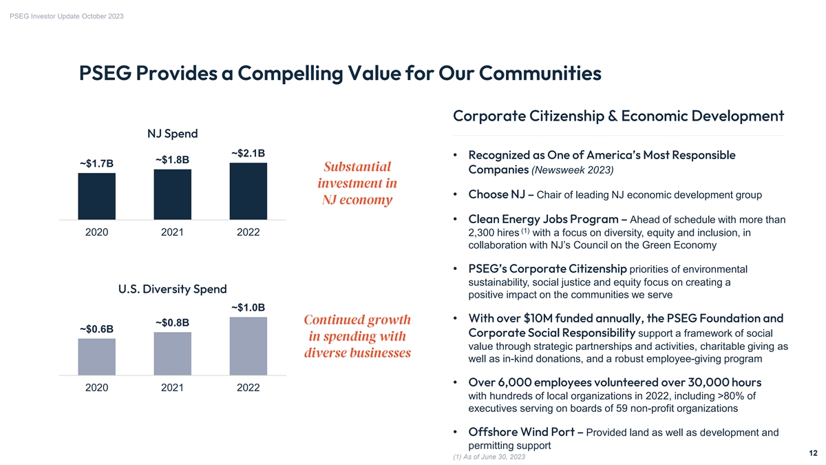PSEG Investor Update October 2023 PSEG Provides Compelling Value for Our Customers We continuously target top quartile performance to deliver better service, at lower cost Lowest Cost, but More Leaks/Mile than Peers: Age of cast iron system Delivering Highest Customer Reliability at Lowest Cost: Achieving drives need for GSMP program low SAIDI outage scores with Lowest Distribution O&M spend 0.00 0 PSE&G 50 0.01 100 0.02 150 0.03 200 PSE&G 0.04 250 300 0.05 $- 0 $100 $200 $300 $400 $- 0 $50 $100 $150 $200 $250 $300 $350 Electric Distribution O&M per Customer ($) Gas Distribution O&M per Customer ($) Lower Cost Lower Cost Peers subset of SNL Energy Electric and Diversified Utilities with > 500,000 customers Peers consist of LDCs in NY, NJ, MD and PA. Achieving Highest Customer Satisfaction at Lowest Cost: For Overall Lowest A&G Cost/Customer vs. Peers Residential Customer Satisfaction PSE&G Elec. 800 780 PSE&G Elec. (#1) 760 Electric 740 PSE&G Gas 720 PSE&G Gas (#2) 700 680 Gas 660 640 $- $50 $100 $150 $200 $250 $- 0 $100 $200 $300 $400 0 Distribution O&M per Customer ($) Lower Cost Lower Cost Electric Peer Companies * Gas Peer Companies * * Peers and Overall Residential Customer Satisfaction from the East Large segment of the J.D. Power 2022 U.S. Electric Peers subset of SNL Energy Electric and Diversified Utilities with > 500,000 customers operating in CT, DE, MD, NY, NJ or PA Electric Utility Residential Customer Satisfaction Study of customers’ satisfaction with electric utility residential services Gas Peers LDCs operating in CT, MD, NJ, NY or PA with > 500,000 customers and the J.D. Power 2022 U.S. Gas Utility Residential Customer Satisfaction of customers’ satisfaction with natural gas residential services. Excludes PSEG Long Island for Electric and Eversource Energy and National Grid for Gas. 11 11 Note: Data and analytics for O&M and A&G Cost provided by S&P Global Market Intelligence. Leaks/Mile from PHMSA annual data. Data from 2022. Higher Reliability Higher Satisfaction SAIDI (minutes per year) Overall Residential Customer Satisfaction Lower Leaks Repaired System Leaks per Mile of Mains