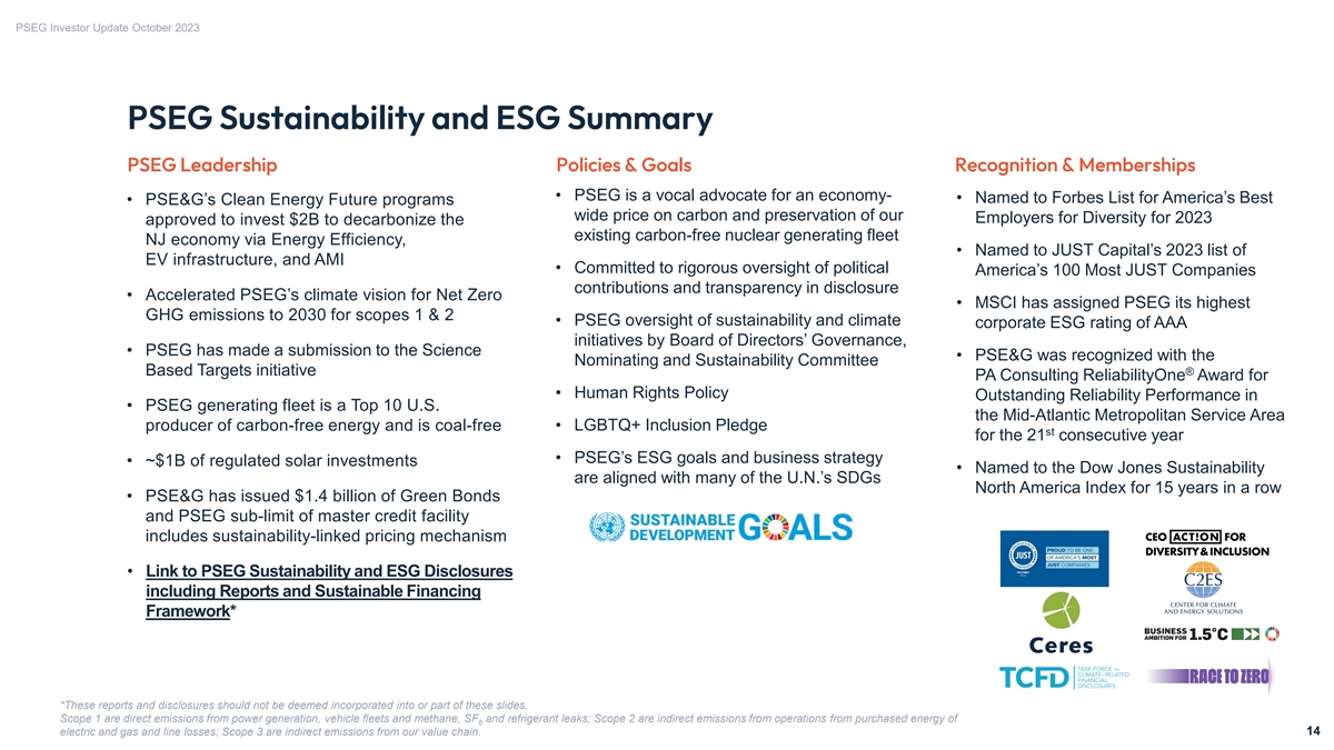 PSEG Investor Update October 2023 PSEG Provides a Compelling Value for the Environment Environmental Targets • Carbon-free generation and net-zero for operations (Scope 1 and 2 emissions) by 2030 • Methane emissions – 22% reduction from 2018 through GSMP • Energy Efficiency – PSE&G on path to achieve EE savings targets established by the BPU • Electrifying transportation – Clean Energy Future–EV and the IAP focus on make-ready investments; targeting PSE&G fleet transition to electric by 2030 • PSEG has made a submission to the Science Based Targets initiative encompassing Scopes 1, 2 and 3 emissions; our submission is under review as part of SBTi’s validation process th Dow Jones Sustainability North America Index – 15 year in a row Carbon-Free Generation • Preserved New Jersey’s carbon-free, base load nuclear generation resource • Retired coal generation • Sold PSEG Fossil generating assets including Kalaeloa 13 13