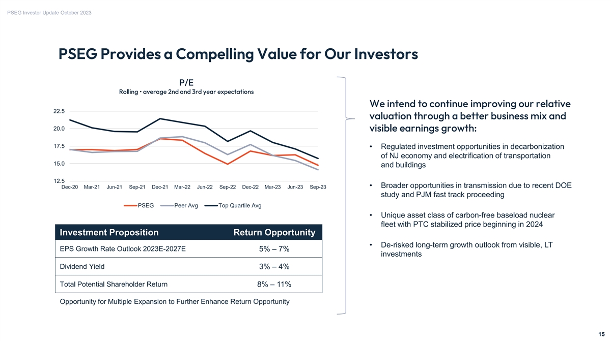 PSEG Investor Update October 2023 PSEG Provides a Compelling Value for Our Investors P/E Rolling • average 2nd and 3rd year expectations We intend to continue improving our relative 22.5 valuation through a better business mix and 20.0 visible earnings growth: 17.5 • Regulated investment opportunities in decarbonization of NJ economy and electrification of transportation 15.0 and buildings 12.5 • Broader opportunities in transmission due to recent DOE Dec-20 Mar-21 Jun-21 Sep-21 Dec-21 Mar-22 Jun-22 Sep-22 Dec-22 Mar-23 Jun-23 Sep-23 study and PJM fast track proceeding PSEG Peer Avg Top Quartile Avg • Unique asset class of carbon-free baseload nuclear fleet with PTC stabilized price beginning in 2024 Investment Proposition Return Opportunity • De-risked long-term growth outlook from visible, LT EPS Growth Rate Outlook 2023E-2027E 5% – 7% investments Dividend Yield 3% – 4% Total Potential Shareholder Return 8% – 11% Opportunity for Multiple Expansion to Further Enhance Return Opportunity 15