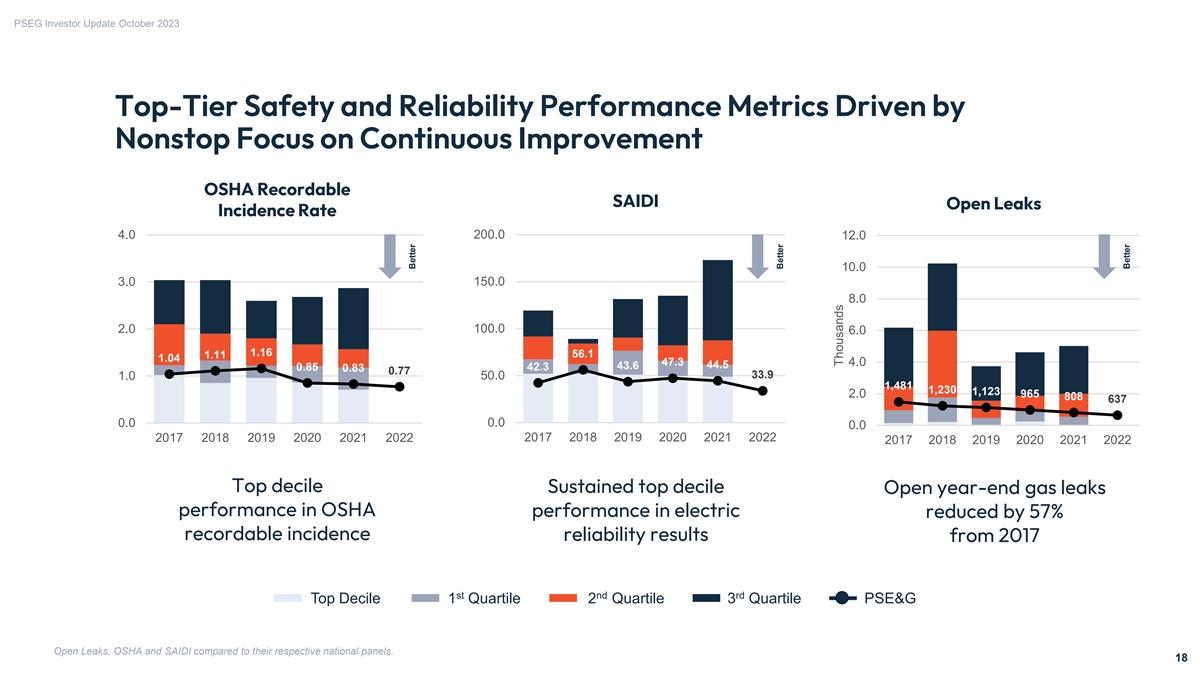 PSEG Investor Update October 2023 Top-Tier Safety and Reliability Performance Metrics Driven by Nonstop Focus on Continuous Improvement OSHA Recordable SAIDI Open Leaks Incidence Rate 4.0 200.0 12.0 10.0 3.0 150.0 8.0 100.0 2.0 6.0 1.16 56.1 1.11 1.04 47.3 4.0 44.5 43.6 0.85 0.83 42.3 0.77 33.9 1.0 50.0 1,481 1,230 1,123 2.0 965 808 637 0.0 0.0 0.0 2017 2018 2019 2020 2021 2022 2017 2018 2019 2020 2021 2022 2017 2018 2019 2020 2021 2022 Top decile Sustained top decile Open year-end gas leaks performance in OSHA performance in electric reduced by 57% recordable incidence reliability results from 2017 st nd rd Top Decile 1 Quartile 2 Quartile 3 Quartile PSE&G Open Leaks, OSHA and SAIDI compared to their respective national panels. 18 18 Better Better Thousands Better