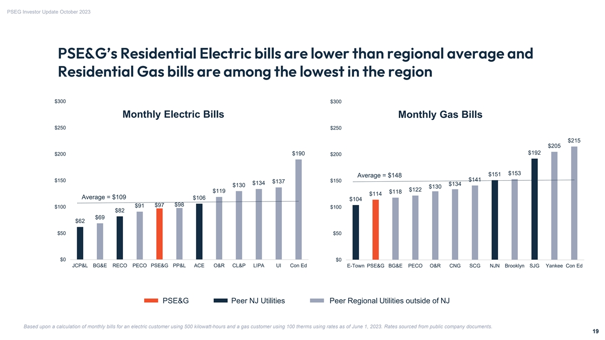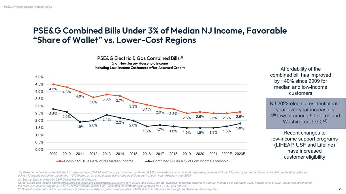 PSEG Investor Update October 2023 PSE&G’s Residential Electric bills are lower than regional average and Residential Gas bills are among the lowest in the region $300 $300 Monthly Electric Bills Monthly Gas Bills $250 $250 $215 $205 $192 $190 $200 $200 $153 $151 Average = $148 $141 $150 $150 $137 $134 $134 $130 $130 $122 $119 $118 $114 Average = $109 $106 $104 $98 $97 $91 $100 $100 $82 $69 $62 $50 $50 $0 $0 JCP&L BG&E RECO PECO PSE&G PP&L ACE O&R CL&P LIPA UI Con Ed E-Town PSE&G BG&E PECO O&R CNG SCG NJN Brooklyn SJG Yankee Con Ed PSE&G Peer NJ Utilities Peer Regional Utilities outside of NJ Based upon a calculation of monthly bills for an electric customer using 500 kilowatt-hours and a gas customer using 100 therms using rates as of June 1, 2023. Rates sourced from public company documents. 19