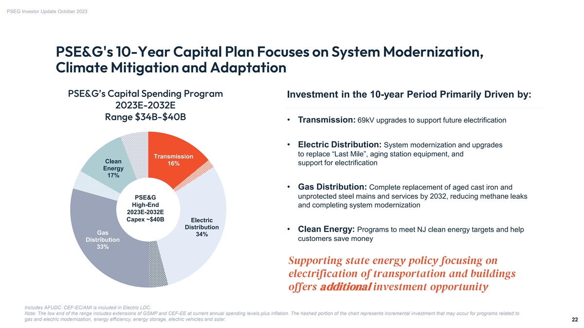 PSEG Investor Update October 2023 PSE&G's 5-Year Capital Investment Plan of $15.5B-$18B is Driven by System Modernization and NJ's Decarbonization and Energy Policy Goals PSE&G Capital Spending 2023E – 2027E 4 3 2 1 0 2023E 2024E 2025E 2026E 2027E Transmission Electric Distribution Gas Distribution Clean Energy Low to High Investment Range* Includes AFUDC. CEF-EC/AMI is included in Electric LDC. *The low end of the range includes extensions of GSMP and CEF-EE at current annual spending levels plus inflation. The hashed portion of the chart represents incremental investment that may occur for programs related to gas and electric modernization, energy efficiency, energy storage, electric vehicles and solar, 21 ($ Billions)