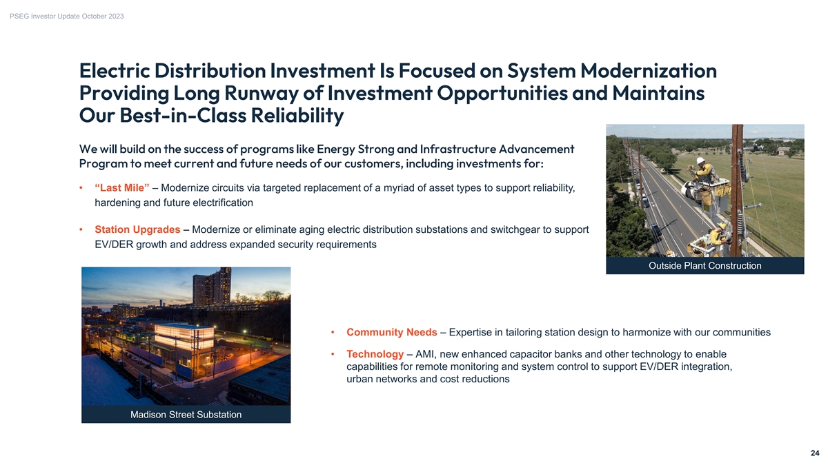 PSEG Investor Update October 2023 Transmission Investment Is Focused on 69kV Upgrades to Support Future Electrification Efforts • Transitioning from large end-of-life projects to 69kV conversion/expansion and new stations to improve reliability, address aging system and load growth including future electrification efforts • Lifecycle investments focused on overhead conductor and pipe cable replacements and upgrades • Generation topology changes due to retiring plants and interconnections/ upgrades for OSW transmission and other renewables • Broader opportunities in transmission due to recent DOE study and PJM fast track proceeding • Annual formula rate incorporates forward test year, eliminates investment and cost recovery lag, which provides predictable earnings growth 23