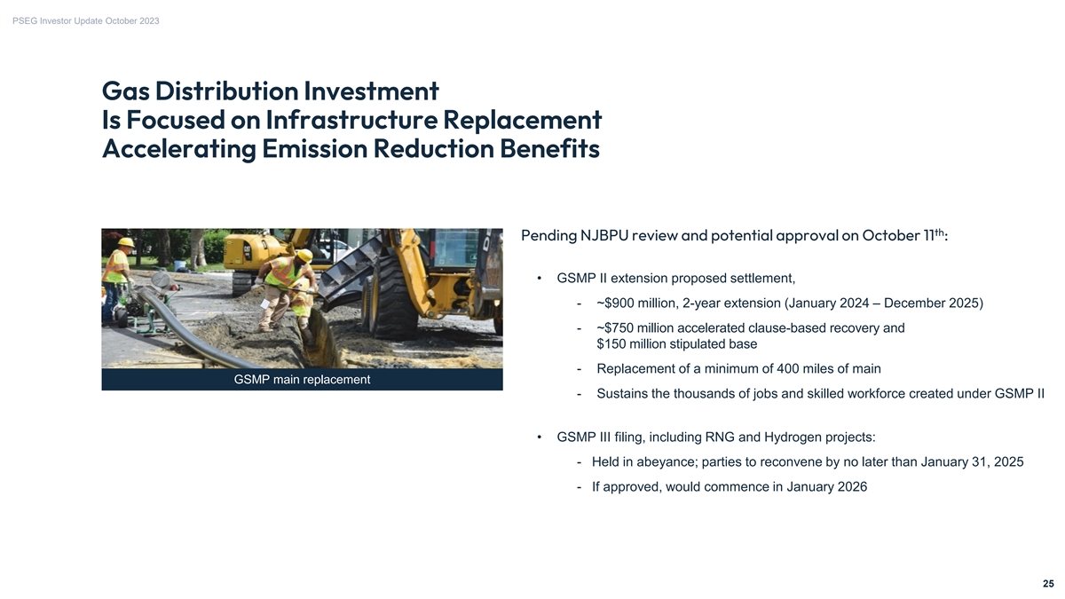 PSEG Investor Update October 2023 Electric Distribution Investment Is Focused on System Modernization Providing Long Runway of Investment Opportunities and Maintains Our Best-in-Class Reliability We will build on the success of programs like Energy Strong and Infrastructure Advancement Program to meet current and future needs of our customers, including investments for: • “Last Mile” – Modernize circuits via targeted replacement of a myriad of asset types to support reliability, hardening and future electrification • Station Upgrades – Modernize or eliminate aging electric distribution substations and switchgear to support EV/DER growth and address expanded security requirements Outside Plant Construction • Community Needs – Expertise in tailoring station design to harmonize with our communities • Technology – AMI, new enhanced capacitor banks and other technology to enable capabilities for remote monitoring and system control to support EV/DER integration, urban networks and cost reductions Madison Street Substation 24