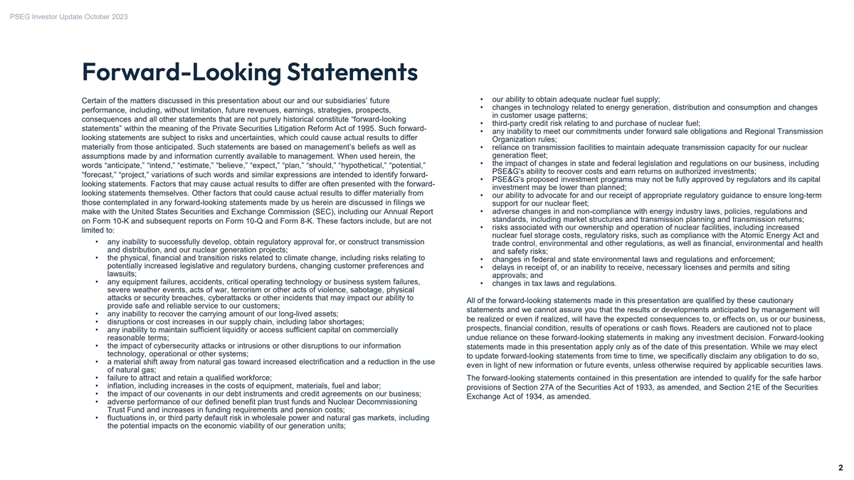 PSEG Investor Update October 2023 Forward-Looking Statements • our ability to obtain adequate nuclear fuel supply; Certain of the matters discussed in this presentation about our and our subsidiaries’ future • changes in technology related to energy generation, distribution and consumption and changes performance, including, without limitation, future revenues, earnings, strategies, prospects, in customer usage patterns; consequences and all other statements that are not purely historical constitute “forward-looking • third-party credit risk relating to and purchase of nuclear fuel; statements” within the meaning of the Private Securities Litigation Reform Act of 1995. Such forward- • any inability to meet our commitments under forward sale obligations and Regional Transmission looking statements are subject to risks and uncertainties, which could cause actual results to differ Organization rules; materially from those anticipated. Such statements are based on management’s beliefs as well as • reliance on transmission facilities to maintain adequate transmission capacity for our nuclear generation fleet; assumptions made by and information currently available to management. When used herein, the • the impact of changes in state and federal legislation and regulations on our business, including words “anticipate,” “intend,” “estimate,” “believe,” “expect,” “plan,” “should,” “hypothetical,” “potential,” PSE&G’s ability to recover costs and earn returns on authorized investments; “forecast,” “project,” variations of such words and similar expressions are intended to identify forward- • PSE&G’s proposed investment programs may not be fully approved by regulators and its capital looking statements. Factors that may cause actual results to differ are often presented with the forward- investment may be lower than planned; looking statements themselves. Other factors that could cause actual results to differ materially from • our ability to advocate for and our receipt of appropriate regulatory guidance to ensure long-term those contemplated in any forward-looking statements made by us herein are discussed in filings we support for our nuclear fleet; make with the United States Securities and Exchange Commission (SEC), including our Annual Report • adverse changes in and non-compliance with energy industry laws, policies, regulations and standards, including market structures and transmission planning and transmission returns; on Form 10-K and subsequent reports on Form 10-Q and Form 8-K. These factors include, but are not • risks associated with our ownership and operation of nuclear facilities, including increased limited to: nuclear fuel storage costs, regulatory risks, such as compliance with the Atomic Energy Act and • any inability to successfully develop, obtain regulatory approval for, or construct transmission trade control, environmental and other regulations, as well as financial, environmental and health and distribution, and our nuclear generation projects; and safety risks; • the physical, financial and transition risks related to climate change, including risks relating to • changes in federal and state environmental laws and regulations and enforcement; potentially increased legislative and regulatory burdens, changing customer preferences and • delays in receipt of, or an inability to receive, necessary licenses and permits and siting lawsuits; approvals; and • any equipment failures, accidents, critical operating technology or business system failures, • changes in tax laws and regulations. severe weather events, acts of war, terrorism or other acts of violence, sabotage, physical attacks or security breaches, cyberattacks or other incidents that may impact our ability to All of the forward-looking statements made in this presentation are qualified by these cautionary provide safe and reliable service to our customers; statements and we cannot assure you that the results or developments anticipated by management will • any inability to recover the carrying amount of our long-lived assets; be realized or even if realized, will have the expected consequences to, or effects on, us or our business, • disruptions or cost increases in our supply chain, including labor shortages; prospects, financial condition, results of operations or cash flows. Readers are cautioned not to place • any inability to maintain sufficient liquidity or access sufficient capital on commercially reasonable terms; undue reliance on these forward-looking statements in making any investment decision. Forward-looking • the impact of cybersecurity attacks or intrusions or other disruptions to our information statements made in this presentation apply only as of the date of this presentation. While we may elect technology, operational or other systems; to update forward-looking statements from time to time, we specifically disclaim any obligation to do so, • a material shift away from natural gas toward increased electrification and a reduction in the use even in light of new information or future events, unless otherwise required by applicable securities laws. of natural gas; • failure to attract and retain a qualified workforce; The forward-looking statements contained in this presentation are intended to qualify for the safe harbor • inflation, including increases in the costs of equipment, materials, fuel and labor; provisions of Section 27A of the Securities Act of 1933, as amended, and Section 21E of the Securities • the impact of our covenants in our debt instruments and credit agreements on our business; Exchange Act of 1934, as amended. • adverse performance of our defined benefit plan trust funds and Nuclear Decommissioning Trust Fund and increases in funding requirements and pension costs; • fluctuations in, or third party default risk in wholesale power and natural gas markets, including the po