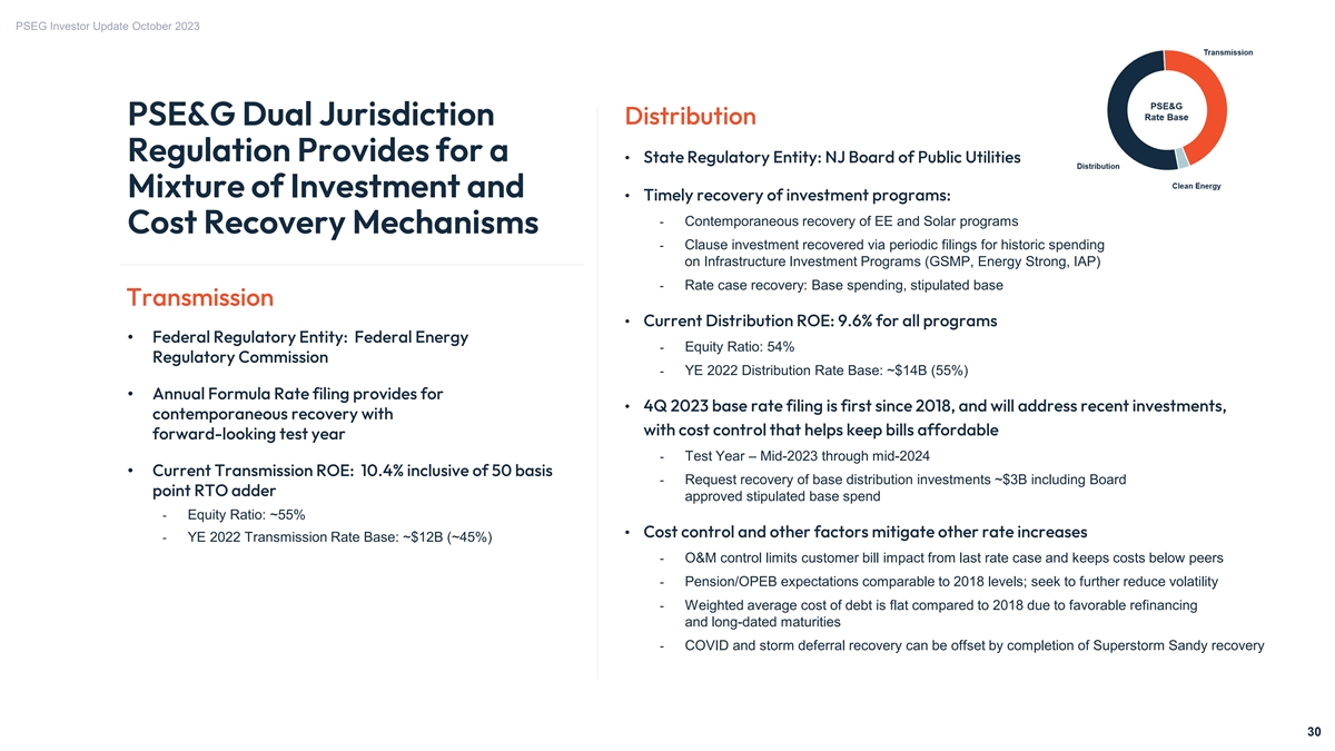 PSEG Investor Update October 2023 Effective Cost Control to Mitigate Inflation Impacts and Preserve Customer Affordability Keeps O&M CAGR ~1% (1) PSE&G O&M Expense • Demonstrated ability to control O&M 1,500 • 2023 cost reductions more than offset inflation and partially addresses the impact of Pension and OPEB 1,000 • Our focus on cost control provides headroom for recovery of capital investment, as $1 of O&M offsets the impact of ~$10 of capital 500 investment on customer bills • Implementation of AMI and productivity efforts are expected to 0 continue to control O&M costs for the next several years 2018 2019 2020 2021 2022 2023E Distribution Transmission 29 (1) Excludes certain regulatory balance account items. ($ Millions)