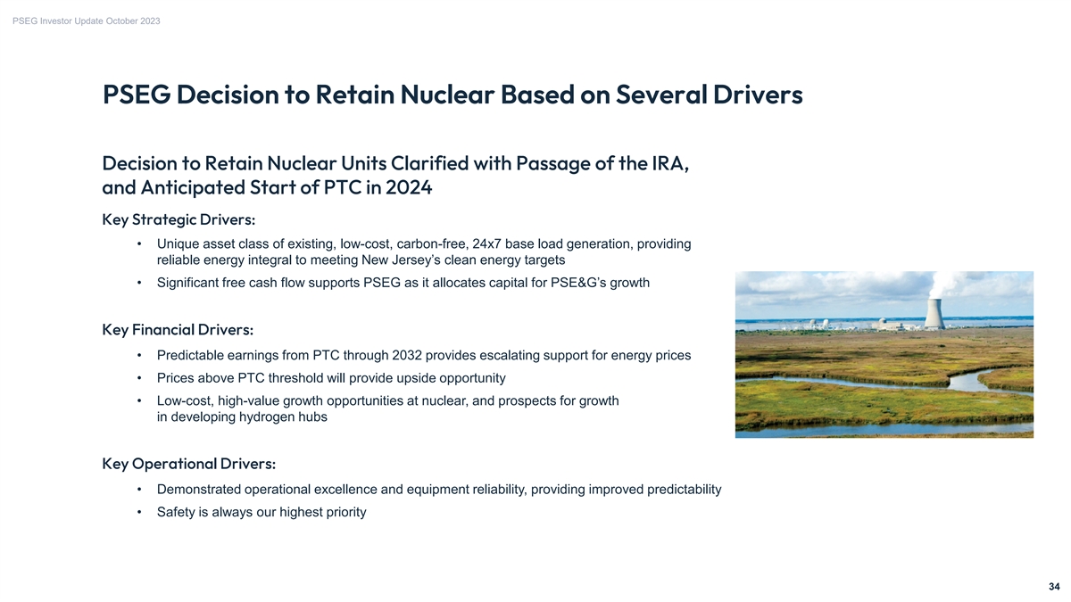 PSEG Investor Update October 2023 PSEG Nuclear • Operates Salem 1 & 2 and Hope Creek • 50% owner of Peach Bottom 2 & 3 • Total 3,766 MW PSEG Power • Opportunities for growth & Other PSEG Gas Operations A more stable, predictable business Serves BGSS contract with Power & PSE&G, providing low-cost that generates significant free gas and multiple value streams cash flow to support PSEG’s Other investment program Other PSEG Long Island contracts, Offshore wind lease area and potential transmission investments, potential Hydrogen investments, and Parent 33