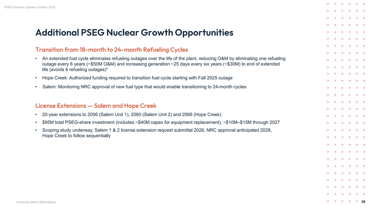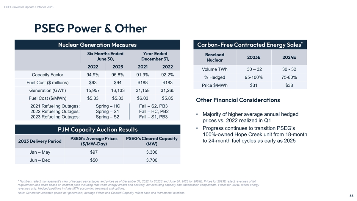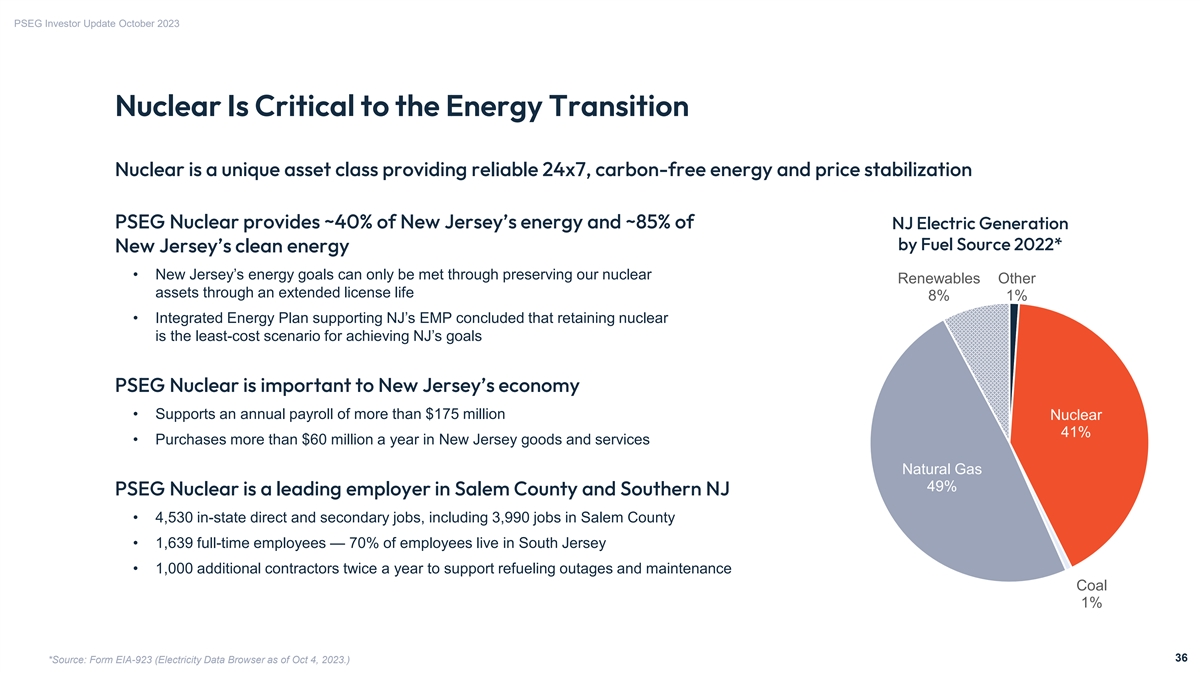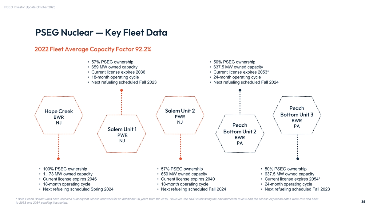 PSEG Investor Update October 2023 PSEG Nuclear — Key Fleet Data 2022 Fleet Average Capacity Factor 92.2% • 57% PSEG ownership • 50% PSEG ownership • 659 MW owned capacity • 637.5 MW owned capacity • Current license expires 2036 • Current license expires 2053* • 18-month operating cycle • 24-month operating cycle • Next refueling scheduled Fall 2023 • Next refueling scheduled Fall 2024 Peach Salem Unit 2 Hope Creek Bottom Unit 3 PWR BWR BWR NJ NJ Peach PA Salem Unit 1 Bottom Unit 2 PWR BWR NJ PA • 100% PSEG ownership • 57% PSEG ownership • 50% PSEG ownership • 1,173 MW owned capacity • 659 MW owned capacity • 637.5 MW owned capacity • Current license expires 2046 • Current license expires 2040 • Current license expires 2054* • 18-month operating cycle • 18-month operating cycle • 24-month operating cycle • Next refueling scheduled Spring 2024 • Next refueling scheduled Fall 2024 • Next refueling scheduled Fall 2023 * Both Peach Bottom units have received subsequent license renewals for an additional 20 years from the NRC. However, the NRC is revisiting the environmental review and the license expiration dates were reverted back 35 35 to 2033 and 2034 pending this review.