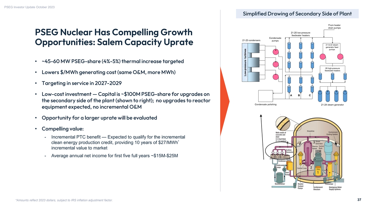 PSEG Investor Update October 2023 Simplified Drawing of Secondary Side of Plant PSEG Nuclear Has Compelling Growth Opportunities: Salem Capacity Uprate • ~45-60 MW PSEG-share (4%-5%) thermal increase targeted • Lowers $/MWh generating cost (same O&M, more MWh) • Targeting in service in 2027-2029 • Low-cost investment — Capital is ~$100M PSEG-share for upgrades on the secondary side of the plant (shown to right); no upgrades to reactor equipment expected, no incremental O&M • Opportunity for a larger uprate will be evaluated • Compelling value: - Incremental PTC benefit — Expected to qualify for the incremental * clean energy production credit, providing 10 years of $27/MWh incremental value to market - Average annual net income for first five full years ~$15M-$25M 37 37 *Amounts reflect 2023 dollars, subject to IRS inflation adjustment factor.