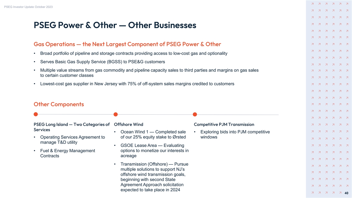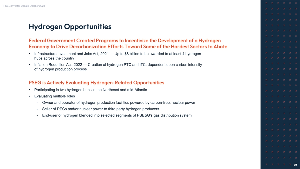 PSEG Investor Update October 2023 Hydrogen Opportunities Federal Government Created Programs to Incentivize the Development of a Hydrogen Economy to Drive Decarbonization Efforts Toward Some of the Hardest Sectors to Abate • Infrastructure Investment and Jobs Act, 2021 — Up to $8 billion to be awarded to at least 4 hydrogen hubs across the country • Inflation Reduction Act, 2022 — Creation of hydrogen PTC and ITC, dependent upon carbon intensity of hydrogen production process PSEG is Actively Evaluating Hydrogen-Related Opportunities • Participating in two hydrogen hubs in the Northeast and mid-Atlantic • Evaluating multiple roles - Owner and operator of hydrogen production facilities powered by carbon-free, nuclear power - Seller of RECs and/or nuclear power to third party hydrogen producers - End-user of hydrogen blended into selected segments of PSE&G’s gas distribution system 39 39 39