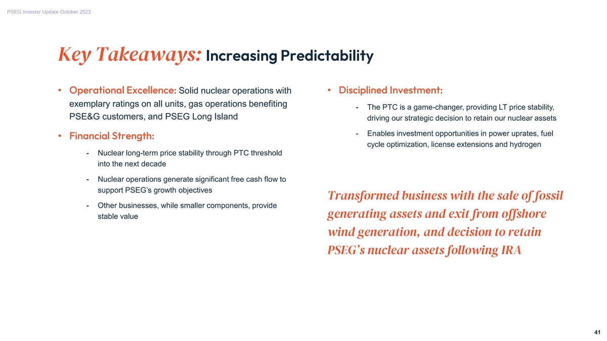 PSEG Investor Update October 2023 Key Takeaways: Increasing Predictability • Operational Excellence: Solid nuclear operations with • Disciplined Investment: exemplary ratings on all units, gas operations benefiting - The PTC is a game-changer, providing LT price stability, PSE&G customers, and PSEG Long Island driving our strategic decision to retain our nuclear assets - Enables investment opportunities in power uprates, fuel • Financial Strength: cycle optimization, license extensions and hydrogen - Nuclear long-term price stability through PTC threshold into the next decade - Nuclear operations generate significant free cash flow to support PSEG’s growth objectives Transformed business with the sale of fossil - Other businesses, while smaller components, provide generating assets and exit from offshore stable value wind generation, and decision to retain PSEG’s nuclear assets following IRA 41