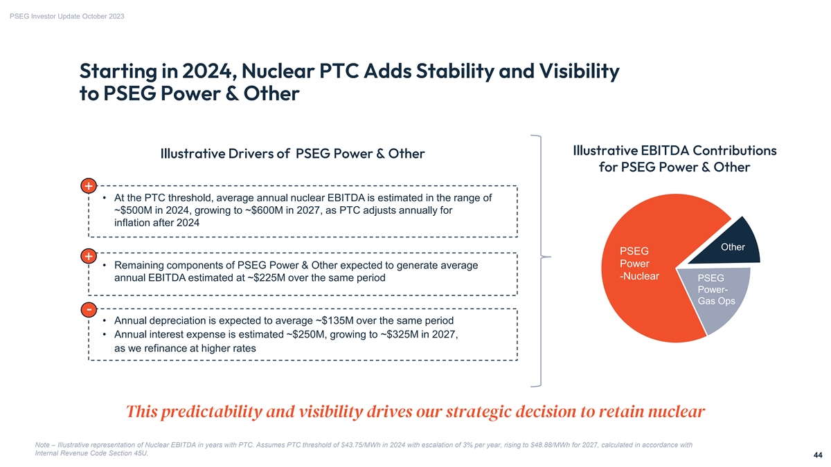 PSEG Investor Update October 2023 PSEG’s Long-term Growth Outlook Driven by PSE&G’s Regulated Earnings Non-GAAP Operating Earnings Continuing on Path of Increasing Predictability • ~85%-90% of PSEG’s non-GAAP operating earnings are from PSE&G PSEG Power & Other • >90% of capital program allocated to PSE&G • Execution of robust capital plan PSE&G • Growth CAGR reflects Nuclear at PTC threshold • Continued cost control 2023E 2027E 43