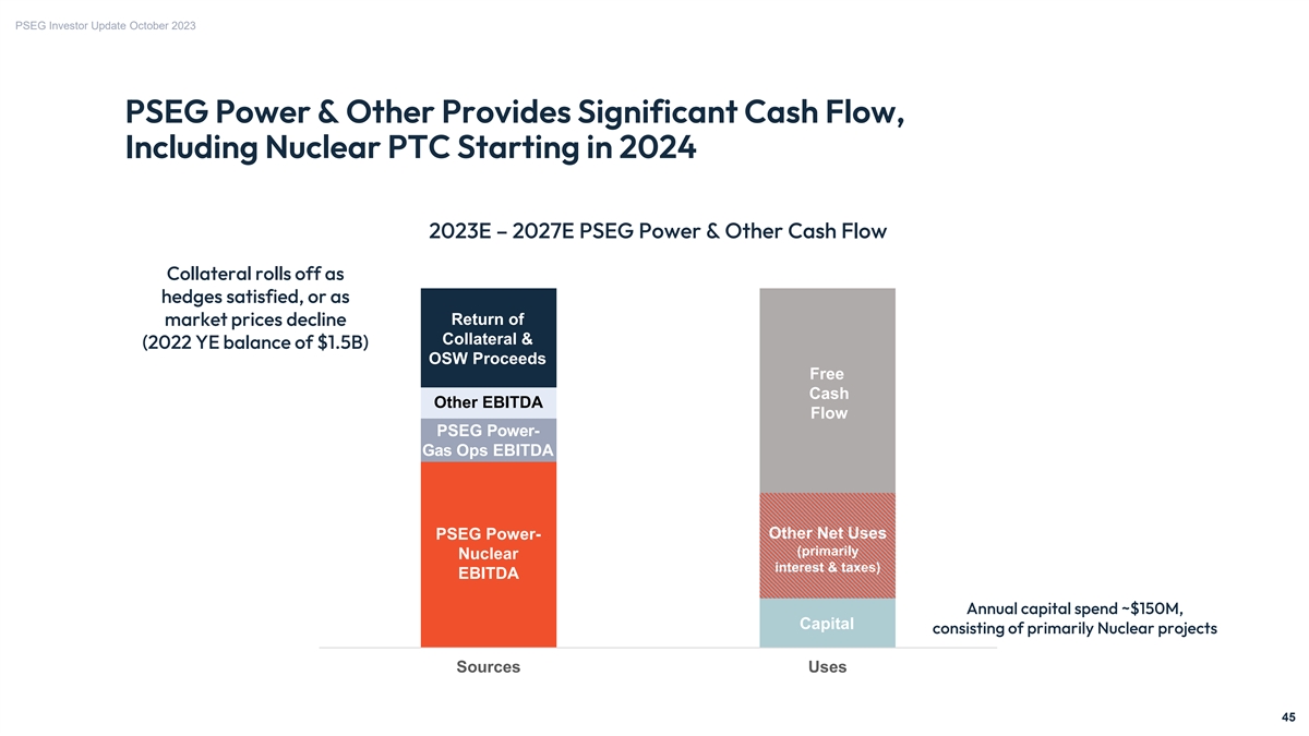 PSEG Investor Update October 2023 Starting in 2024, Nuclear PTC Adds Stability and Visibility to PSEG Power & Other Illustrative EBITDA Contributions Illustrative Drivers of PSEG Power & Other for PSEG Power & Other + • At the PTC threshold, average annual nuclear EBITDA is estimated in the range of ~$500M in 2024, growing to ~$600M in 2027, as PTC adjusts annually for inflation after 2024 Other PSEG + Power • Remaining components of PSEG Power & Other expected to generate average -Nuclear annual EBITDA estimated at ~$225M over the same period PSEG Power- Gas Ops - • Annual depreciation is expected to average ~$135M over the same period • Annual interest expense is estimated ~$250M, growing to ~$325M in 2027, as we refinance at higher rates This predictability and visibility drives our strategic decision to retain nuclear Note – Illustrative representation of Nuclear EBITDA in years with PTC. Assumes PTC threshold of $43.75/MWh in 2024 with escalation of 3% per year, rising to $48.88/MWh for 2027, calculated in accordance with Internal Revenue Code Section 45U. 44