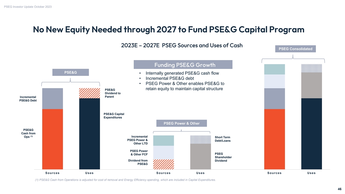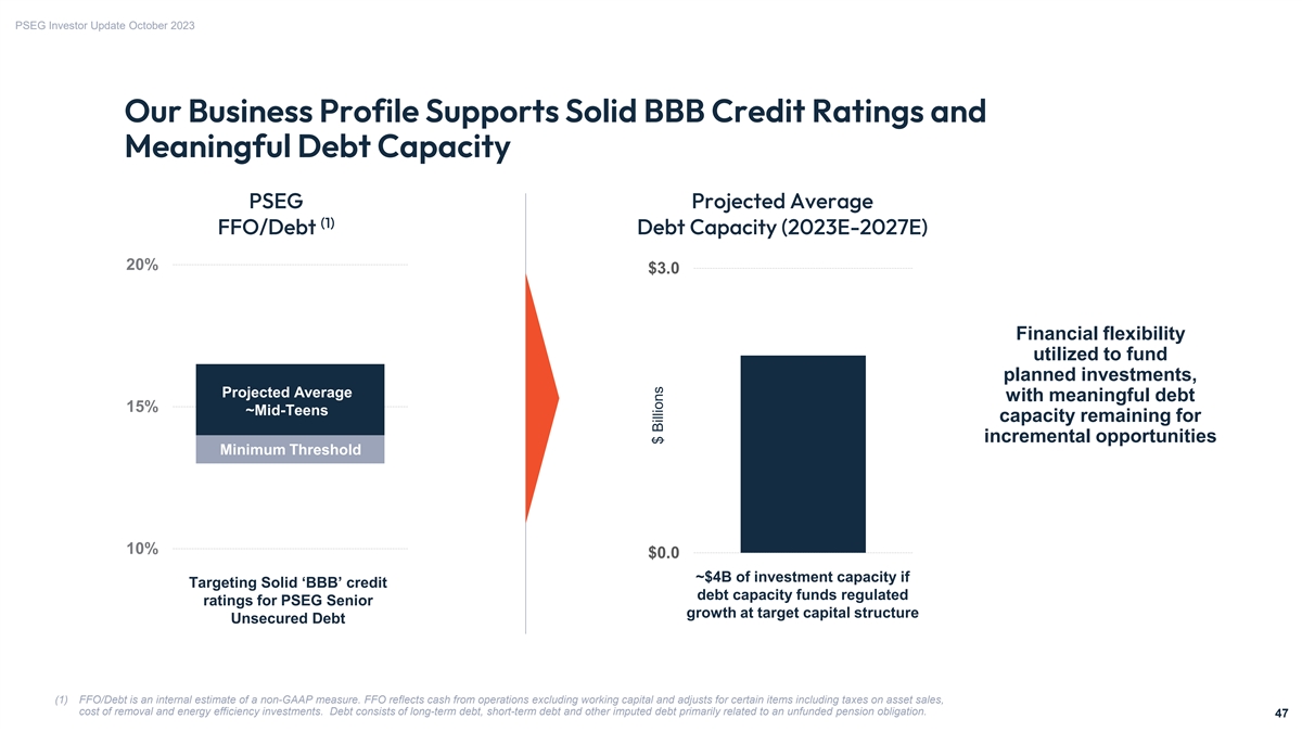 PSEG Investor Update October 2023 No New Equity Needed through 2027 to Fund PSE&G Capital Program 2023E – 2027E PSEG Sources and Uses of Cash PSEG Consolidated Funding PSE&G Growth PSE&G • Internally generated PSE&G cash flow • Incremental PSE&G debt • PSEG Power & Other enables PSE&G to retain equity to maintain capital structure PSE&G Dividend to Parent Incremental PSE&G Debt PSE&G Capital Expenditures PSEG Power & Other PSE&G Cash from (1) Incremental Ops Short Term PSEG Power & Debt/Loans Other LTD PSEG Power PSEG & Other FCF Shareholder Dividend from Dividend PSE&G S o u r ces U ses S o u r ces U ses S o u r ces U ses (1) PSE&G Cash from Operations is adjusted for cost of removal and Energy Efficiency spending, which are included in Capital Expenditures. 46